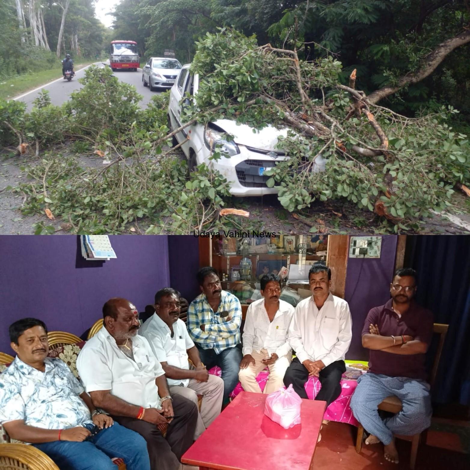 ಉದಯವಾಹಿನಿ ಕುಶಾಲನಗರ:- ಕುಶಾಲ ನಗರ ಮಡಿಕೇರಿ ರಸ್ತೆಯಲ್ಲಿ ಚಲಿಸುತ್ತಿದ್ದ ಕಾರಿನ ಮೇಲೆ ಮರದ ಕೊಂಬೆಯೊಂದು ಬಿದ್ದು ಕಾರಿನಲ್ಲಿದ್ದ ವ್ಯಕ್ತಿ ಅದೃಷ್ಟವತಾಸ್ ಯಾವುದೇ ಅಪಾಯ ಸಂಭವಿಸದೆ ಪಾರಾಗಿರುವ ಘಟನೆ ನಡೆದಿದೆ.ಕುಶಾಲನಗರದ ಕರ್ನಾಟಕದ ಕಾವಲು ಪಡೆಯ ಜಿಲ್ಲಾಧ್ಯಕ್ಷರಾದ ಎಂ ಕೃಷ್ಣ ಅವರು ಮಡಿಕೇರಿಯಿಂದ ಕುಶಾಲನಗರದ ಕಡೆಗೆ ತಮ್ಮ ಕಾರಿನಲ್ಲಿ KA12 P7905 ಬರುತ್ತಿದ್ದ ಸಂದರ್ಭ ಆನೇಕಾಡು ಅರಣ್ಯದ ಬಳಿ ಮರವೊಂದರ ಬೃಹತ್ ಕೊಂಬೆ ಕಾರಿನ ಮೇಲೆ ಬಿದ್ದಿದ್ದು ಕಾರು ಬಹುತೇಕ ಜಖಂ ಗೊಂಡಿದೆ. ಕಾರು ಚಾಲನೆ ಮಾಡುತ್ತಿದ್ದ ಕೃಷ್ಣ ಅವರಿಗೆ ಅಲ್ಪಸ್ವಲ್ಪ ಗಾಯಗಳಾಗಿದ್ದು ಸ್ಥಳದಲ್ಲಿದ್ದ ಕೆಲವರು ರಕ್ಷಣೆ ಮಾಡಿ ಕುಶಾಲನಗರದ ಸರ್ಕಾರಿ ಆಸ್ಪತ್ರೆಗೆ ಸಾಗಿಸಿದ್ದಾರೆ ಮಾಹಿತಿ ದೊರೆತ ಅರಣ್ಯ ಅಧಿಕಾರಿಗಳು ಸಿಬ್ಬಂದಿಗಳು ಸ್ಥಳಕ್ಕೆ ಭೇಟಿ ನೀಡಿ ಮರವನ್ನು ತೆರವುಗೊಳಿಸಿ ಮುಂದಿನ ಕ್ರಮ ಕೈಗೊಂಡಿದ್ದಾರೆ. (ಕರ್ನಾಟಕ ರಾಜ್ಯ ಕಾವಲು ಪಡೆಯ ರಾಜ್ಯಾಧ್ಯಕ್ಷರಾದ ಮೋಹನ್ ಕುಮಾರ್ ಗೌಡ ಮತ್ತು ಪದಾಧಿಕಾರಿಗಳು ಕೃಷ್ಣ ಅವರ ಮನೆಗೆ ಭೇಟಿ ನೀಡಿ ಸಾಂತ್ವನ ಹೇಳಿದರು)
