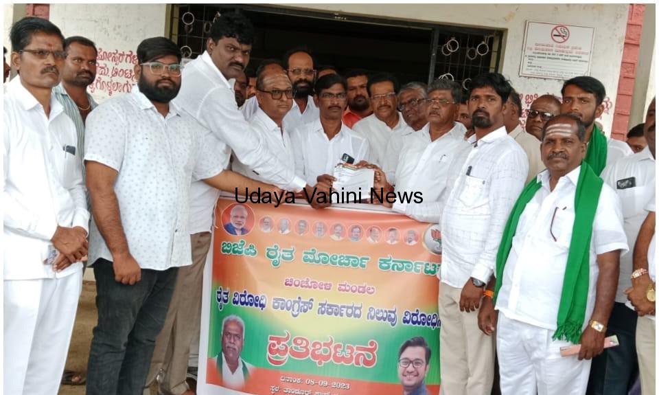 ಉದಯವಾಹಿನಿ,ಚಿಂಚೋಳಿ: ಪಟ್ಟಣದ ತಹಸೀಲ್ ಕಾರ್ಯಾಲಯದ ಎದುರು ಭಾತೀಯ ಜನತಾ ಪಕ್ಷದ ರೈತ ಮೋರ್ಚಾ ವತಿಯಿಂದ ಕಾಂಗ್ರೆಸ್ ಸರ್ಕಾರದ ರೈತ ಜನ ವಿರೋಧಿ ನಿಲುವು ಖಂಡಿಸಿ ಪ್ರತಿಭಟನೆ ನಡೆಸಿ ತಹಸೀಲ್ದಾರ್ ಮೂಲಕ ಶುಕ್ರವಾರ ಸರ್ಕಾರಕ್ಕೆ ಮನವಿಪತ್ರ ಸಲ್ಲಿಸಿದರು.ಬಿಜೆಪಿ ಪಕ್ಷದ ಮಂಡಲ ಅಧ್ಯಕ್ಷ ಸಂತೋಷ ಗಡಂತಿ,ಮಾಜಿ ಜಿಪಂ.ಸದಸ್ಯ ಗೌತಮ್ ಪಾಟೀಲ,ಭೀಮಶೇಟ್ಟಿ ಮುರುಡಾ,ಕೆ.ಎಂ.ಬಾರಿ,ಗೋಪಾಲರಾವ ಕಟ್ಟಿಮನಿ,ಚಿತ್ರಶೇಖರ ಪಾಟೀಲ,ಮಲ್ಲಿನಾಥ ಪಾಟೀಲ,ಜಗದೀಶಸಿಂಗ್ ಠಾಕೂರ್,ಅಶೋಕ ಚವ್ಹಾಣ,ರಾಜು ಪವಾರ,ನಾಗೇಂದ್ರಪ್ಪ ಸರಡಗಿ,ಶಿವರಾಯ ಹಿತ್ತಲ್,ಅಭಿಷೇಕ್,ಹಣಮಂತ,ರಾಜಕುಮಾ ರ,ವೀರಭದ್ರಪ್ಪ ತೆಂಗಳಿ,ಜೈಪ್ರಕಾಶ,ಶ್ರೀಕಾಂತ ಪಿತ್ತಲ್,ಕುಪೇಂದ್ರ ಹೂಗಾರ,ಅನೇಕರಿದ್ದರು.