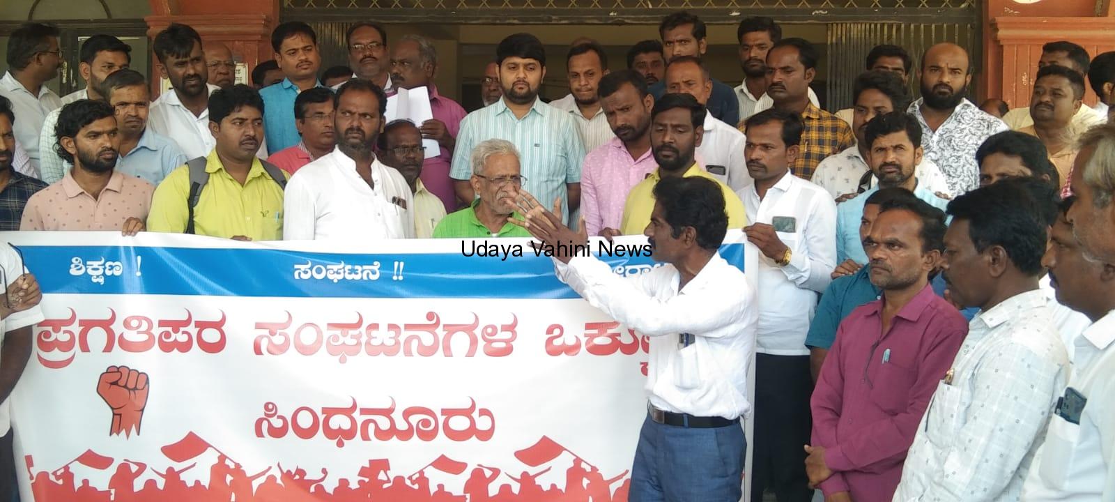 ಉದಯವಾಹಿನಿ ಸಿಂಧನೂರು: ಕರ್ನಾಟಕದಲ್ಲಿ ಕಾರ್ಯನಿರ್ವಹಿಸುತ್ತಿರುವ ಸುಮಾರು 14 ಸಾವಿರ ಆತಿಥಿ ಉಪನ್ಯಾಸಕರಿಗೆ ವಿವಿಧ ಬೇಡಿಕೆಗಳನ್ನು ಈ ಡೇರಿಸುವಂತೆ ಒತ್ತಾಯಿಸಿ ನಗರದ ಪ್ರವಾಸಿ ಮಂದಿರದಿಂದ ಕಾಲ್ನಡಿಗೆ ಜಾಥಾ ಮೂಲಕ ಸರ್ಕಾರದ ವಿರುದ್ಧ ಘೋಷಣೆ ಕೂಗುತ್ತ ತಾಲ್ಲೂಕು ಕಛೇರಿ ಮುಂದೆ ಪ್ರತಿಭಟನೆ ನಡೆಸಿದರು.