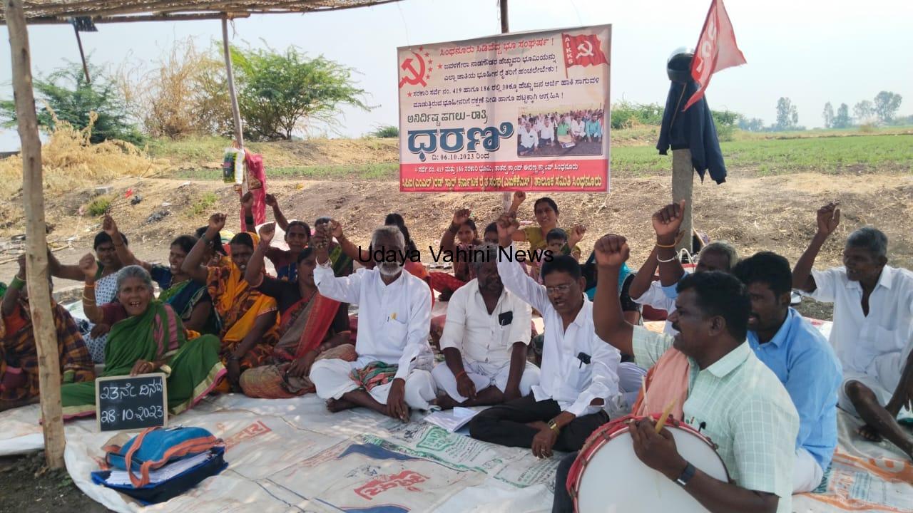 ಉದಯವಾಹಿನಿ ಸಿಂಧನೂರು :ಜವಳಗೇರಾ ನಾಡಗೌಡರ ಹೆಚ್ಚುವರಿ ಭೂಮಿಯನ್ನು ಎಲ್ಲಾ ಜಾತಿಯ ಭೂಹೀನ ರೈತರಿಗೆ ಹಂಚಿಕೆಗಾಗಿ, ಸರಕಾರಿ ಸರ್ವೆ ನಂ. 419 ಹಾಗೂ 186 ರಲ್ಲಿ 30ಕ್ಕೂ ಹೆಚ್ಚು ಜನ ಅರ್ಜಿ ಹಾಕಿ ಸಾಗುವಳಿ ಮಾಡುತ್ತಿರುವ ಭೂಹೀನರಿಗೆ ಪಟ್ಟಕ್ಕಾಗಿ ಆಗ್ರಹಿಸಿ, ಸಿಪಿಐ(ಎಂಎಲ್)ರಡ್ ಸ್ಟಾರ್ ಹಾಗೂ ಕರ್ನಾಟಕ ರೈತ ಸಂಘ(AIKKS) ತಾಲೂಕ ಸಮಿತಿ ಸಿಂಧನೂರು ನೇತೃತ್ವದಲ್ಲಿ ದಿ: 06.10.2023 ರಿಂದ ಆರಂಭವಾದ ಭೂ ಧರಣಿ 23ನೇ ದಿನದಲ್ಲಿ ಮುಂದುವರೆದ ಅನಿರ್ದಿಷ್ಟ ಹಗಲು-ರಾತ್ರಿ ಧರಣಿಗೆ ಜನಕವಿಗಳಾದಂತಹ ಸಿ.ದಾನಪ್ಪ ನಿಲೋಗಲ್ ಅವರು ಬೆಂಬಲಿಸಿ ಮಾತನಾಡಿ, ಸದರಿ ಭೂ ಹೋರಾಟವು ಮೆದಿಕಿನಾಳ, ಚಿಕ್ಕಹೆಸರೂರ, ಬಸಾಪೂರ, ಮಹ್ಮದ್ ನಗರ ದಂತಹ ಭೂ ಹೋರಾಟದ ಮುಂದುವರಿಕೆಯಾಗಿ ನಡೆದಿದೆ. ಕರ್ನಾಟಕ ಸರಕಾರ ಹೆಚ್ಚುವರಿ ಭೂಮಿಯಾಗಿದ್ದು ಜಿಲ್ಲಾಧಿಕಾರಿಗಳು ಕೂಡಲೇ ಈ ಹೋರಾಟಕ್ಕೆ ಸ್ಪಂದಿಸಿ ಭೂ ಪಟ್ಟಾ ನೀಡಬೇಕು. ಭೂಹೀನರು ಸಾಗುವಳಿ ಮಾಡಲಿಕ್ಕೆ ಅವಕಾಶ ನೀಡಬೇಕು. ಭೂಮಿಗಾಗಿ ನಡೆದಿರುವ ಹೋರಾಟ ಇನ್ನೂ ಸಾವಿರಾರು ಎಕರೆ ಹೆಚ್ಚುವರಿ ಭೂಮಿಯನ್ನು ಕಾನೂನು ಕಣ್ಣಿನಿಂದ ಉಳಿಸಿಕೊಂಡ ಸರಕಾರಿ ಭೂಮಿ ದಲಿತ ಹಿಂದುಳಿದವರು ಸೇರಿದಂತೆ ಎಲ್ಲಾ ಜಾತೀಯ ಬಡವರಿಗೆ ಹಂಚಲು ರಾಯಚೂರು ಜಿಲ್ಲೆಯಾದ್ಯಂತ ಭೂ ಸಂಘರ್ಷದ ಹೋರಾಟ ವಿಸ್ತರಣೆಗೊಳ್ಳಬೇಕಾಗಿದೆ. ಬಾಬಾ ಸಾಹೇಬ ಅಂಬೇಡ್ಕರ್ ರಚಿಸಿದ ಸಂವಿಧಾನದಡಿಯಲ್ಲಿ ಭೂಹೀನರಿಗೆ ಭೂಮಿ ಹಂಚಬೇಕೆಂದರು.ಈ ಸಂದರ್ಭದಲ್ಲಿ ಎಂ.ಗಂಗಾಧರ, ಹನುಮಂತಪ್ಪ ಗೋಡ್ಯಾಳ, ಅಂಬಮ್ಮ ಬಸಾಪೂರ, ಗಂಗಮ್ಮ,ಸಂಗಮ್ಮ, ರೇಣುಕಾ, ಹಂಪಮ್ಮ, ದೇವಮ್ಮ, ಮೀನಾಕ್ಷಿ, ಜಗಧೀಶ್ವರಿ, ಯಮನಮ್ಮ, ಬಿಭೀ ಪಾತಿಮಾ, ರುಕ್ಮಿಣೆಮ್ಮ, ಚೈತ್ರಾ, ಲಕ್ಷ್ಮೀ, ತುಳಸಮ್ಮ, ಈರಮ್ಮ, ಹುಸೇನಬಾನು,ಹೆಚ್.ಆರ್.ಹೊಸಮನಿ,ಪರಶುರಾಮ, ನೇತ್ರಾವತಿ, ಲಕ್ಷ್ಮೀ ಪೂಜಾರ, ಮುದಿಯಪ್ಪ, ಮೈಬುಸಾಬ, ಅಪ್ಪಣ್ಣ, ಗಂಗಪ್ಪ, ಶಂಕ್ರಪ್ಪ, ಸೇರಿದಂತೆ ಇತರರು ಇದ್ದರು.ಮಾಬುಸಾಬ ಬೆಳ್ಳಟ್ಟಿ ತಾಲೂಕು ಕಾರ್ಯದರ್ಶಿ ಸಿಪಿಐ(ಎಂಎಲ್)ರೆಡ್ ಸ್ಟಾರ್ ಅಂಬಮ್ಮ ಬಸಾಪೂರ ತಾಲೂಕು ಅಧ್ಯಕ್ಷರು. ಇದ್ದರು.