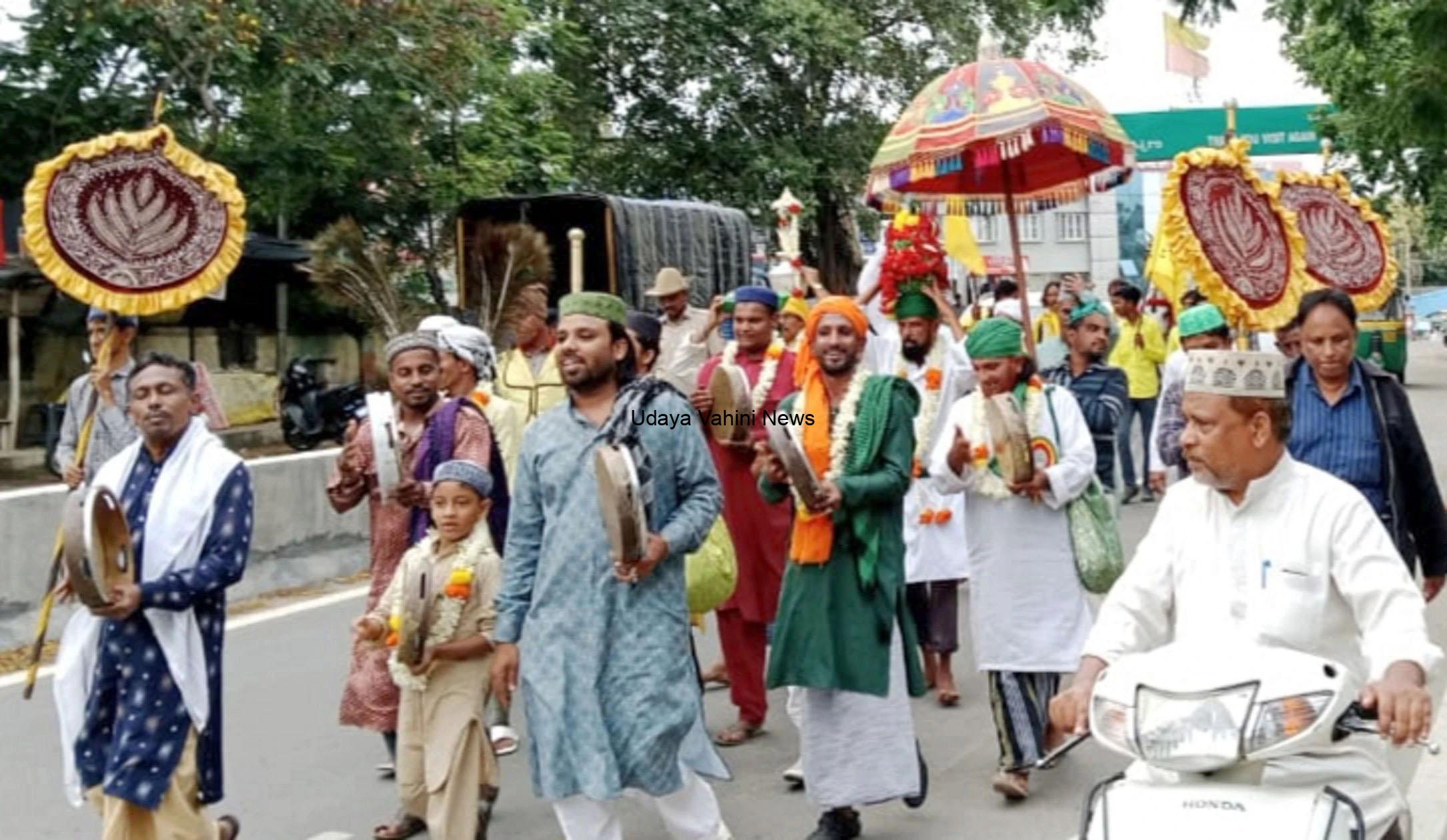 ಜಾಮಿಯಾ ಮಸೀದಿಯಲ್ಲಿ ಧಾರ್ಮಿಕ ಮುಖಂಡರು ವಿಶೇಷ ಪ್ರಾರ್ಥನೆ ಸಲ್ಲಿಸಿದ ಬಳಿಕ ಮೆರವಣಿಗೆಗೆ ಚಾಲನೆ ನೀಡಲಾಯಿತು. ಫಕೀರರು ತಮಟೆ ಬಡಿಯುತ್ತಾ ಉತ್ಸವದ ಜತೆ ಹೆಜ್ಜೆ ಹಾಕಿದರು. ಗಾಯಕರು ದಾರಿಯುದ್ದಕ್ಕೂ ಕವ್ವಾಲಿ ಹಾಡಿ ಗಮನ ಸೆಳೆದರು. ಯುವಕರು ಹೈದರ್ ಭಾವಚಿತ್ರವುಳ್ಳ ಬ್ಯಾನರ್ ಹಿಡಿದು ಸಾಗಿದರು.ಪಟ್ಟಣದ ಪುರಸಭೆ ವೃತ್ತ, ಕುವೆಂಪು ವೃತ್ತ, ಸಾರ್ವಜನಿಕ ಆಸ್ಪತ್ರೆ, ಬೇಸಿಗೆ ಅರಮನೆ, ಅಬ್ಬೆದುಬ್ವಾ ಚರ್ಚ್ ಮಾರ್ಗವಾಗಿ ಮರವಣಿಗೆ ಗುಂಬಸ್ ತಲುಪಿತು.