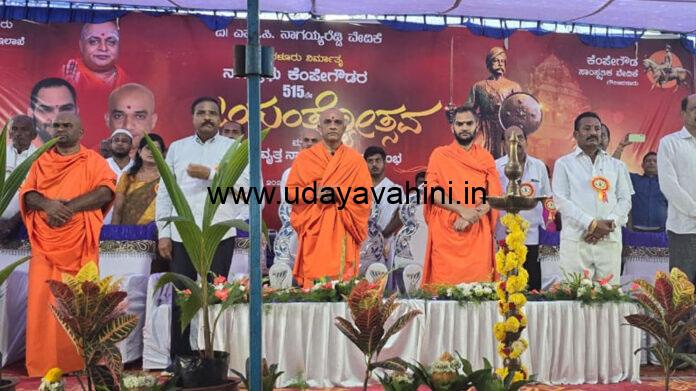 ಶಿರಾ ತಾಲೂಕಿನ ಶ್ರೀ ಕ್ಷೇತ್ರ ಪಟ್ಟನಾಯಕನಹಳ್ಳಿಯ ಶ್ರೀ ನಂಜಾವಧೂತ ಸ್ವಾಮೀಜಿ ಅವರು ಮಾತನಾಡಿ, ಸಮಾಜದಲ್ಲಿ ಆದರ್ಶ ಪ್ರಾಯರ ಜಯಂತಿಗಳು ಮುಂದಿನ ಪೀಳಿಗೆಗೆ ಮಾರ್ಗದರ್ಶನವಾಗಬೇಕು ಎಂಬ ನಿಟ್ಟಿನಲ್ಲಿ ಆದರ್ಶ ವ್ಯಕ್ತಿಗಳ ಜಯಂತಿ ಆಚರಣೆ ಮಾಡಲಾಗುತ್ತದೆ. ನಾಡಪ್ರಭು ಕೆಂಪೇಗೌಡರು ಬೆಂಗಳೂರು ನಾಡನ್ನು ಕಟ್ಟಿ ಇಂದಿಗೆ 500 ವರ್ಷಗಳು ಕಳೆದಿವೆ. ಇಂದು ಅಂತಾರಾಷ್ಟ್ರೀಯ ಮಟ್ಟದಲ್ಲಿ ವಿವಿಧ ಕ್ಷೇತ್ರಗಳಲ್ಲಿ ಬೆಂಗಳೂರು ತನ್ನದೇ ಆದ ಪ್ರಸಿದ್ಧಿ ಪಡೆದುಕೊಂಡಿದೆ. ಕೆಂಪೇಗೌಡರ ನಾಡ ಚಿಂತನೆ ಇಂದಿನ ರಾಜಕೀಯ ವ್ಯಕ್ತಿಗಳಿಗೆ ಆದರ್ಶಪ್ರಾಯವಾಗಿದೆ ಎಂದು ತಿಳಿಸಿದರು.