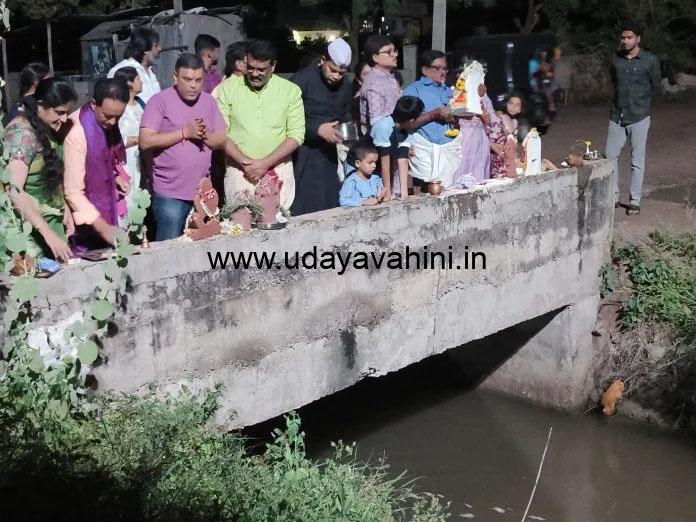 ಮನೆಯಿಂದ ಪೂಜೆಯೊಂದಿಗೆ ತಂದ ಗಣೇಶನನ್ನು ಕಾಲುವೆಯ ಕಟ್ಟೆಯ ಮೇಲಿರಿಸಿ ಮತ್ತೊಮ್ಮೆ ಪೂಜಿಸಿ ನೀರಿನಲ್ಲಿ ಹಾಕಲಾಯ್ತು. ಕೆಲವರು ಪಟಾಕಿ ಸಂಭ್ರಮಿಸಿದರು.