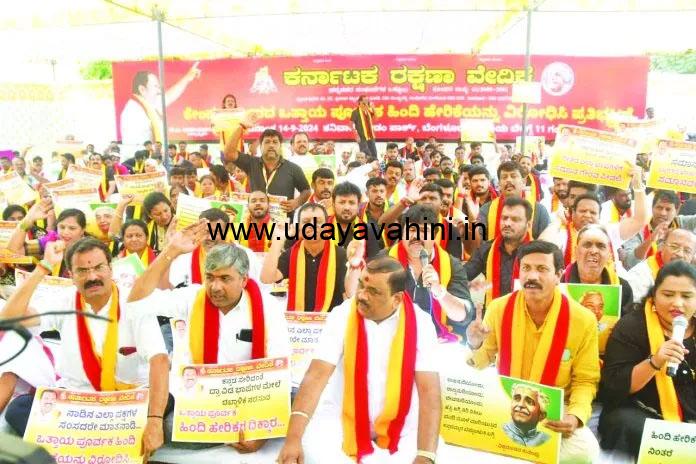 ಉದಯವಾಹಿನಿ, ಬೆಂಗಳೂರು: ಹಿಂದಿ ದಿವಸ ಆಚರಣೆಯ ಹೆಸರಲ್ಲಿ ಅನ್ಯಭಾಷಿಕರ ಮೇಲೆ ಹಿಂದಿ ಹೇರುವ ಹುನ್ನಾರವನ್ನು ಕೇಂದ್ರ ಸರ್ಕಾ ನಡೆಸುತ್ತಿದೆ ಎಂದು ಆರೋಪಿಸಿ ಕರ್ನಾಟಕ ರಕ್ಷಣಾ ವೇದಿಕೆ ಕಾರ್ಯಕರ್ತರು ನಗರದಲ್ಲಿ ಬೃಹತ್ ಪ್ರತಿಭಟನೆ ನಡೆಸಿದರು. ವೇದಿಕೆಯ ಅಧ್ಯಕ್ಷ ಟಿ.ಎ.ನಾರಯಣಗೌಡ ಅವರ ನೇತೃತ್ವದಲ್ಲಿ ಸ್ವಾತಂತ್ರ್ಯ ಉದ್ಯಾನವನದ ಮುಂಭಾಗ ಪ್ರತಿಭಟನೆ ನಡೆಸಿದ ಕಾರ್ಯಕರ್ತರು ಹಿಂದಿ ಏರಿಕೆಯ ಕೇಂದ್ರ ಸರ್ಕಾರದ ಕ್ರಮವನ್ನು ಖಂಡಿಸಿದರು.