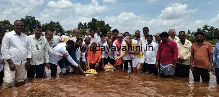 ಉದಯವಾಹಿನಿ, ಹಗರಿಬೊಮ್ಮನಹಳ್ಳಿ: ತಾಲೂಕಿನ ತಂಬ್ರಹಳ್ಳಿ ಶ್ರೀ ಬಂಡೆ ರಂಗನಾಥ ದೇವಸ್ಥಾನ ಬಳಿ ಇರುವ ತುಂಗಭದ್ರ ನದಿ ಹಿನ್ನೀರಿಗೆ ಶಾಸಕ ಕೆ ನೇಮಿರಾಜ್ ನಾಯ್ಕ್ ಭಾನುವಾರ ಬಾಗಿನ ಅರ್ಪಿಸಿದರು.