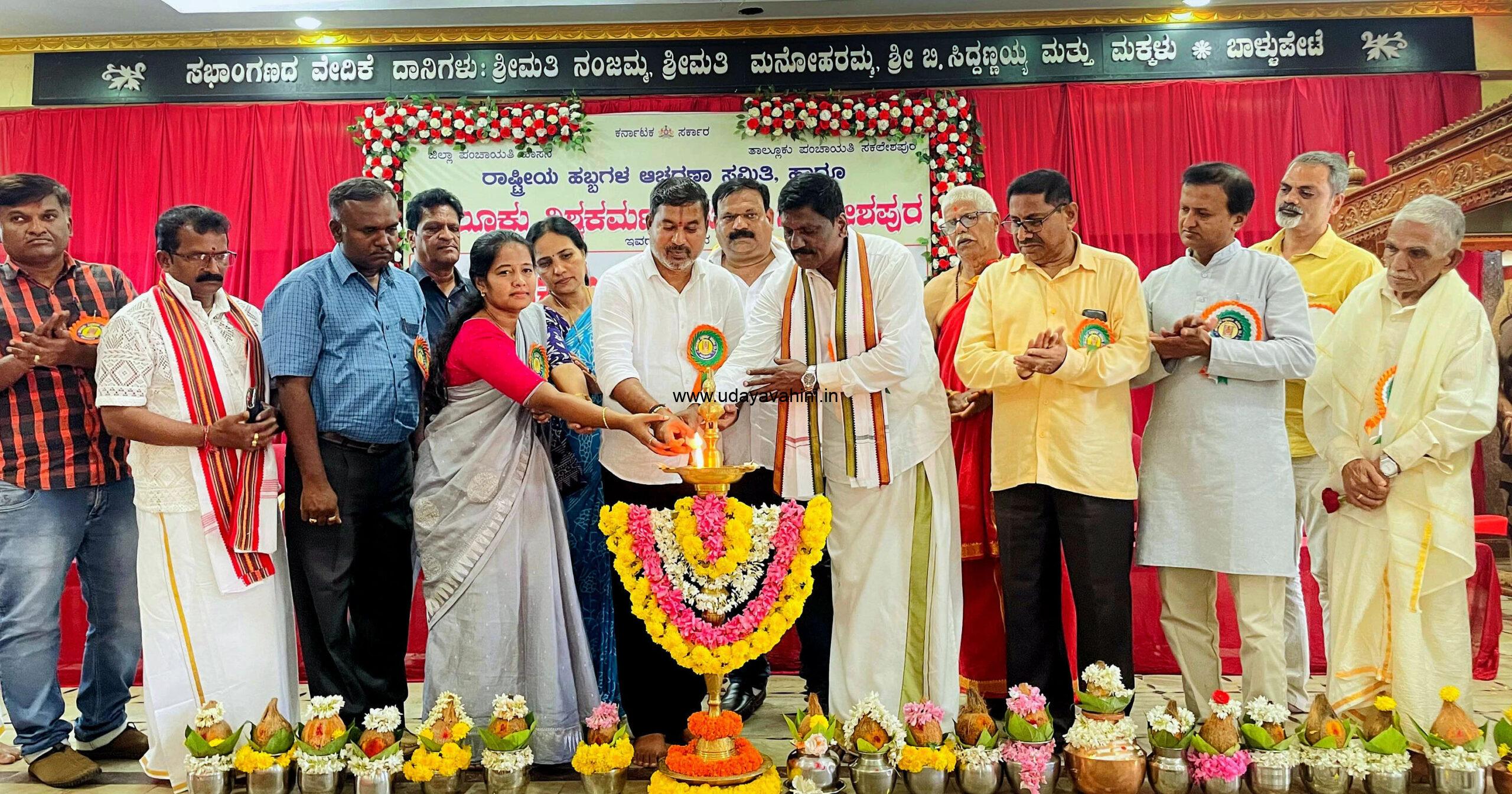 ತಾಲ್ಲೂಕು ಪಂಚಾಯಿತಿ ಮಾಜಿ ಸದಸ್ಯ ಯಡೇಹಳ್ಳಿ ಆರ್. ಮಂಜುನಾಥ್ ಮಾತನಾಡಿ, ‘ದೇವರನ್ನೇ ಸೃಷ್ಟಿ ಮಾಡುವ ಕಲೆ ಇರುವ ವಿಶ್ವಕರ್ಮರು ನಮ್ಮ ನಿಮ್ಮೊಳಗೆ ಇರುವುದು ಹೆಮ್ಮೆಯ ವಿಷಯ. ಮನಸ್ಸಿಗೆ ನೋವಾದಾಗ, ಬೇಸರವಾದಾಗ ದೇವರ ವಿಗ್ರಹದ ಮುಂದೆ ಪ್ರಾರ್ಥನೆ ಮಾಡುತ್ತೇವೆ. ಮೌನವಾಗಿ ಕುಳಿತುಕೊಳ್ಳುತ್ತೇವೆ. ಮನಸ್ಸಿಗೆ ನೆಮ್ಮದಿ ನೀಡುವಂತಹ ಸುಂದರವಾದ ಮೂರ್ತಿಯನ್ನು ವಿಶ್ವಕರ್ಮರು ಕೆತ್ತನೆ ಮಾಡುತ್ತಾರೆ. ರಥ, ಮನೆಯ ಬಾಗಿಲು, ಚಿನ್ನಾಭರಣಗಳ ತಯಾರಿಕೆ ಹಿಂದೆ ವಿಶ್ವಕರ್ಮರ ಕೈಚಳಕವಿದೆ’ ಎಂದರು. ಎಸ್ಎಸ್ಎಲ್ಸಿ ಹಾಗೂ ಪಿಯುಸಿ ಪರೀಕ್ಷೆಯಲ್ಲಿ ಹೆಚ್ಚು ಅಂಕ ಗಳಿಸಿದ ವಿಶ್ವಕರ್ಮ ಸಮುದಾಯದ ವಿದ್ಯಾರ್ಥಿಗಳನ್ನು ಸನ್ಮಾನಿಸಲಾಯಿತು. ಕಾರ್ಯಕ್ರಮಕ್ಕೂ ಮೊದಲು ಸಕಲೇಶ್ವರಸ್ವಾಮಿ ದೇವಸ್ಥಾನದಲ್ಲಿ ಪೂಜೆ ಸಲ್ಲಿಸಿ ವಿಶ್ವಕರ್ಮ ಭಾವಚಿತ್ರವನ್ನು ಪಟ್ಟಣದ ಪ್ರಮುಖ ಬೀದಿಗಳಲ್ಲಿ ಮೆರವಣಿಗೆ ಮಾಡಲಾಯಿತು.