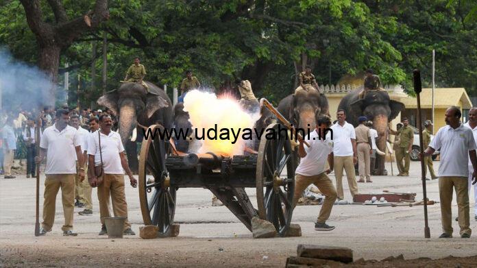 ಉದಯವಾಹಿನಿ, ಮೈಸೂರು : ನಾಡಹಬ್ಬ ದಸರಾ ಮಹೋತ್ಸವದ ಜಂಬೂ ಸವಾರಿಯ ದಿನ ಅಂಬಾರಿಗೆ ಪುಷ್ಪಾರ್ಚನೆ ಸಲ್ಲಿಸಿ, ರಾಷ್ಟ್ರಗೀತೆ ಮೊಳಗುವಾಗ ಹಾರಿಸುವ 21 ಕುಶಾಲ ತೋಪುಗಳ ತಾಲೀಮಿಗೆ ಬಳಸುವ ಫಿರಂಗಿಗಳ ಡ್ರೈ ರನ್ ಆರಂಭಗೊಂಡಿದೆ.