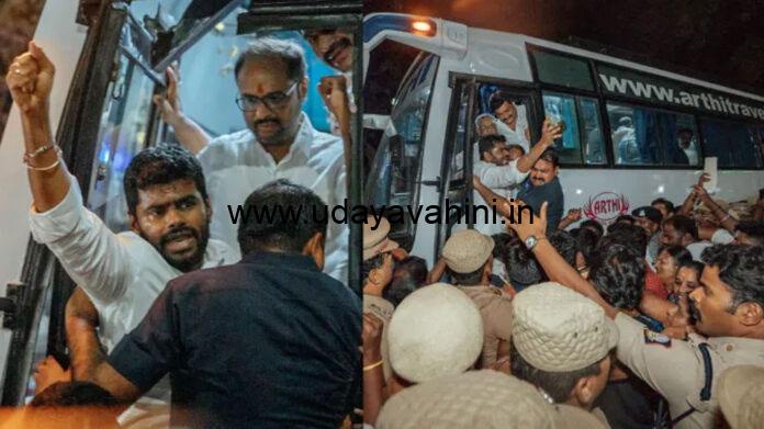 ಒಬ್ಬ ಭಯೋತ್ಪಾದಕನ ಸಾವನ್ನು ವೈಭವೀಕರಿಸಲಾಗುತ್ತಿದೆ ಎಂದು ಡಿಎಂಕೆ ಸರ್ಕಾರದ ವಿರುದ್ಧ ಆರೋಪ ಮಾಡಿ ಕಳೆದ ದಿನ ಪ್ರತಿಭಟನೆ ಮಾಡುವ ವೇಳೆ ಅಣ್ಣಾಮಲೈ ಅವರನ್ನು ಪೊಲೀಸರು ಬಂಧಿಸಿದ್ದರು.