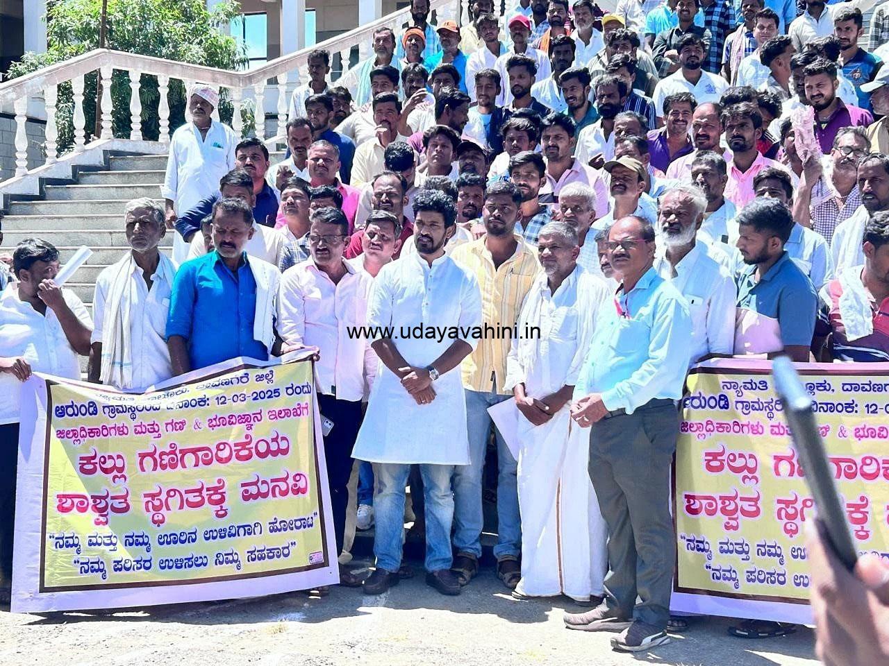 ಉದಯವಾಹಿನಿ, ದಾವಣಗೆರೆ: ಕಲ್ಲು ಗಣಿಗಾರಿಕೆಯನ್ನು ಶಾಶ್ವತವಾಗಿ ಸ್ಥಗಿತಗೊಳಿಸಬೇಕು ಹಾಗೂ ಕ್ರಷರ್ ಕಾಮಗಾರಿಯನ್ನು ಕೂಡಲೇ ನಿಲ್ಲಿಸಬೇಕು ಎಂದು ಒತ್ತಾಯಿಸಿ ನ್ಯಾಮತಿ ತಾಲ್ಲೂಕಿನ ಆರುಂಡಿ ಗ್ರಾಮಸ್ಥರು ಜಿಲ್ಲಾಧಿಕಾರಿ ಕಚೇರಿ ಎದುರು ಬುಧವಾರ ಪ್ರತಿಭಟನೆ ನಡೆಸಿದರು.ಗ್ರಾಮ ಹಾಗೂ ತಾಲ್ಲೂಕು ಕೇಂದ್ರದಲ್ಲಿ ಹೋರಾಟ ನಡೆಸಿದ ಜನರು ಜಿಲ್ಲಾಡಳಿತದ ಗಮನ ಸೆಳೆಯಲು ದಾವಣಗೆರೆಗೆ ಬಂದಿದ್ದರು. ಜಿಲ್ಲಾಧಿಕಾರಿ ಜಿ.ಎಂ. ಗಂಗಾಧರಸ್ವಾಮಿ ಹಾಗೂ ಗಣಿ ಮತ್ತು ಭೂವಿಜ್ಞಾನ ಇಲಾಖೆಯ ಅಧಿಕಾರಿಗಳಿಗೆ ಮನವಿ ಸಲ್ಲಿಸಿದರು.ಆರುಂಡಿ ಗ್ರಾಮದಲ್ಲಿ 20 ವರ್ಷಗಳಿಂದ ಕಲ್ಲು ಗಣಿಗಾರಿಕೆ ನಡೆಯುತ್ತಿದೆ.6 ಕಲ್ಲು ಕ್ಯಾರಿಗಳಿದ್ದು, ಪರಿಸರಕ್ಕೆ ಧಕ್ಕೆ ಉಂಟಾಗಿದೆ. ನಿಯಮ ಬಾಹಿರವಾಗಿ ನಡೆಯುತ್ತಿರುವ ಗಣಿಗಾರಿಕೆಯಿಂದ ಕೃಷಿ, ಹೈನುಗಾರಿಕೆ ಹಾಗೂ ಜನಜೀವನಕ್ಕೆ ತೊಂದರೆಯಾಗುತ್ತಿದೆ. ಎರಡು ಕೆರೆಗಳ ನೀರು ಸಂಪೂರ್ಣ ಕಲುಷಿತಗೊಂಡಿವೆ ಎಂದು ಆಕ್ರೋಶ ವ್ಯಕ್ತಪಡಿಸಿದರು. . ನಿಯಮ ಬಾಹಿರವಾಗಿ ನಡೆಯುತ್ತಿರುವ ಗಣಿಗಾರಿಕೆಯಿಂದ ಕೃಷಿ, ಹೈನುಗಾರಿಕೆ ಹಾಗೂ ಜನಜೀವನಕ್ಕೆ ತೊಂದರೆಯಾಗುತ್ತಿದೆ. ಎರಡು ಕೆರೆಗಳ ನೀರು ಸಂಪೂರ್ಣ ಕಲುಷಿತಗೊಂಡಿವೆ ಎಂದು ಆಕ್ರೋಶ ವ್ಯಕ್ತಪಡಿಸಿದರು.