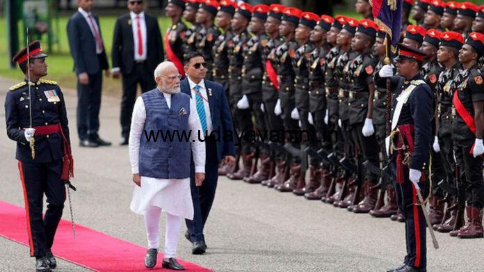ಉದಯವಾಹಿನಿ, ನವದೆಹಲಿ: ಪ್ರಧಾನಿ ನರೇಂದ್ರ ಮೋದಿ ಅವರು ತಮ್ಮ ಮೂರನೇ ಅವಧಿಗೆ ದ್ವೀಪ ರಾಷ್ಟಕ್ಕೆ ಮೊದಲ ಬಾರಿಗೆ ಭೇಟಿ ನೀಡಿದಾಗ ಅವರಿಗೆ ಶ್ರೀಲಂಕಾದಲ್ಲಿ ಔಪಚಾರಿಕ ಗೌರವ ರಕ್ಷೆ ನೀಡಲಾಯಿತು.ಹಿಂದೂ ಮಹಾಸಾಗರ ಪ್ರದೇಶದಾದ್ಯಂತ ಚೀನಾದ ಪ್ರಭಾವವನ್ನು ವಿಸ್ತರಿಸುವ ಆತಂಕದ ಮಧ್ಯೆ ಎರಡೂ ದೇಶಗಳು ರಕ್ಷಣೆ, ಇಂಧನ, ಡಿಜಿಟಲ್ ಮೂಲಸೌಕರ್ಯ, ಆರೋಗ್ಯ ಮತ್ತು ವ್ಯಾಪಾರ ಕ್ಷೇತ್ರಗಳಲ್ಲಿ ಪ್ರಮುಖ ಒಪ್ಪಂದಗಳಿಗೆ ಸಹಿ ಹಾಕುವ ನಿರೀಕ್ಷೆಯಿದೆ.
