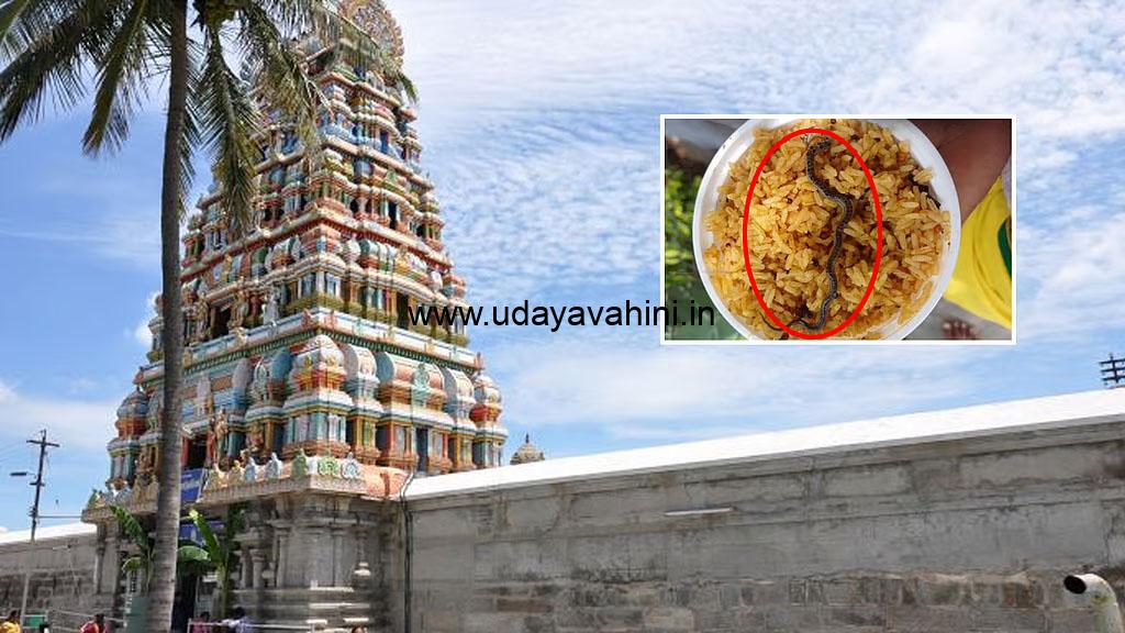 ಉದಯವಾಹಿನಿ, ಚೆನ್ನೈ: ಹಿಂದೂ ಧಾರ್ಮಿಕ ಮತ್ತು ದತ್ತಿ ದತ್ತಿ ಇಲಾಖೆಯ ನಿಯಂತ್ರಣದಲ್ಲಿರುವ ದೇವಾಲಯವೊಂದರ ಪ್ರಸಾದದಲ್ಲಿ ಸತ್ತ ಹಾವು ಪತ್ತೆಯಾಗಿರುವುದು ಇದೀಗ ಸಾಮಾಜಿಕ ಜಾಲತಾಣಗಳಲ್ಲಿ ವ್ಯಾಪಕ ಚರ್ಚೆಗೆ ಕಾರಣವಾಗಿದೆ.ಪ್ರಸಾದದಲ್ಲಿ ಸತ್ತ ಹಾವು ಪತ್ತೆಯಾಗಿರುವ ಫೋಟೋ ಇದೀಗ ಸಾಮಾಜಿಕ ಜಾಲತಾಣಗಳಲ್ಲಿ ವ್ಯಾಪಕ ವೈರಲ್ ಆಗುತ್ತಿದೆ. ದೇವಸ್ಥಾನದಲ್ಲಿ ನೀಡಲಾದ ಪುಳಿಯೊಗರೆ ಪ್ರಸಾದದಲ್ಲಿ ಈ ಹಾವು ಪತ್ತೆಯಾಗಿದ್ದು, ಪ್ರಸಾದದ ಚಿತ್ರಗಳು ಸಾಮಾಜಿಕ ಮಾಧ್ಯಮದಲ್ಲಿ ವೈರಲ್ ಆಗಿವೆ ಎಂದು ಹೇಳಲಾಗಿದೆ.