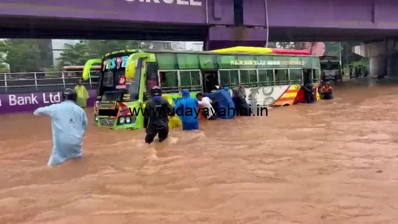 ಉದಯವಾಹಿನಿ, ಮಂಗಳೂರು: ನಗರದಲ್ಲಿ ಕಳೆದ ಕೆಲ ಗಂಟೆಯಿಂದ ಭಾರೀ ಮಳೆಯಾಗುತ್ತಿದ್ದು, ಪಂಪ್ವೆಲ್ ವೃತ್ತವು ಮತ್ತೆ ಮುಳುಗಡೆಯಾಗಿದೆ. ಭಾರೀ ಮಳೆ ನೀರು ರಸ್ತೆಯಲ್ಲೇ ಹರಿಯುತ್ತಿದ್ದು, ವಾಹನ ಸವಾರರು ಪರದಾಡುತ್ತಿದ್ದಾರೆ.ರಸ್ತೆಯಲ್ಲೇ ಭಾರೀ ಪ್ರಮಾಣದ ಮಳೆ ನೀರು ಹರಿಯುತ್ತಿರುವ ಹಿನ್ನೆಲೆ ಸಂಪೂರ್ಣ ರಸ್ತೆ ಸಂಚಾರ ಬಂದ್ ಆಗಿದೆ. ಇದೀಗ ರಸ್ತೆಯುದ್ದಕ್ಕೂ ವಾಹನಗಳು ಸಾಲುಗಟ್ಟಿ ನಿಂತಿವೆ. ಮಳೆ ನೀರಿನಲ್ಲೇ ಸಂಚರಿಸಲು ಯತ್ನಿಸಿದ ಖಾಸಗಿ ಬಸ್ಸೊಂದು ನಡುರಸ್ತೆಯಲ್ಲೇ ಕೆಟ್ಟು ನಿಂತಿದ್ದು, ನಂತರ ಸ್ಥಳೀಯರು ಬಸ್ನ್ನು ತಳ್ಳಿ ರಸ್ತೆ ಪಕ್ಕಕ್ಕೆ ನಿಲ್ಲಿಸಿದ್ದಾರೆ.