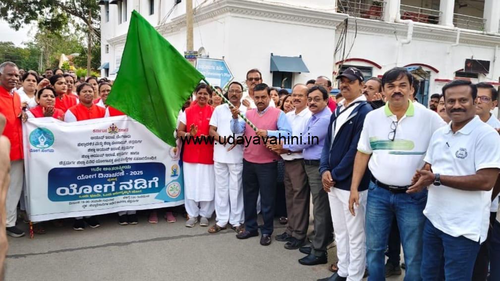 ಉದಯವಾಹಿನಿ, ಚಿತ್ರದುರ್ಗ: 11ನೇ ಅಂತರಾಷ್ಟ್ರೀಯ ಯೋಗ ದಿನಾಚರಣೆ ಅಂಗವಾಗಿ ಭಾರತೀಯ ಯೋಗ ಶಿಕ್ಷಣ ಸಂಸ್ಥೆ ಸೇರಿದಂತೆ ಜಿಲ್ಲೆಯ ವಿವಿಧ ಯೋಗ ಸಂಘ ಸಂಸ್ಥೆಗಳ ಸಹಕಾರದೊಂದಿಗೆ ಇಂದು ಚಿತ್ರದುರ್ಗ ನಗರದ ಪ್ರಮುಖ ಬೀದಿಗಳಲ್ಲಿ ಯೋಗ ನಡಿಗೆ ಕಾರ್ಯಕ್ರಮವನ್ನು ಆಯೋಜಿಸಲಾಗಿತ್ತು. ಈ ಕಾರ್ಯಕ್ರಮ ಮಾನ್ಯ ಅಪರ ಜಿಲ್ಲಾಧಿಕಾರಿಗಳಾದ ಶ್ರೀ ಕುಮಾರಸ್ವಾಮಿ ಅವರು ಹಾಗೂ ಜಿಲ್ಲಾ ಪಂಚಾಯತ್ ಉಪ ಕಾರ್ಯದರ್ಶಿಗಳಾದ ಶ್ರೀ ರಂಗಸ್ವಾಮಿ ಅವರು ಹಸಿರು ನಿಶಾನೆ ತೋರುವುದರೊಂದಿಗೆ ಉದ್ಘಾಟಿಸಿದರು. ಕಾರ್ಯಕ್ರಮದಲ್ಲಿ ಮಾತನಾಡಿದ ಶ್ರೀಯುತ ಕುಮಾರಸ್ವಾಮಿ ಅವರು ಯೋಗ ಭಾರತ ದೇಶದ ಹೆಮ್ಮೆಯ ಕೊಡುಗೆ.