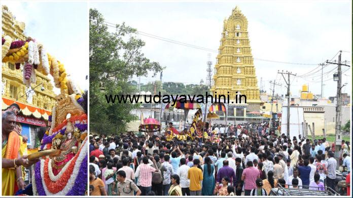ಉದಯವಾಹಿನಿ, ಮೈಸೂರು: ಚಾಮುಂಡಿಬೆಟ್ಟ ದಲ್ಲಿ ನಾಡ ಅಧಿದೇವತೆ ಚಾಮುಂಡೇಶ್ವರಿ ತಾಯಿಯ ವರ್ಧಂತಿ ಉತ್ಸವ ಲಕ್ಷಾಂತರ ಭಕ್ತರ ಸಮುಖದಲ್ಲಿ ವಿಜೃಂಭಣೆಯಿಂದ ನೆರವೇರಿತು. ಮೈಸೂರು ರಾಜವಂಶಸ್ಥರ ಕುಲದೇವ ತೆಯೂ ಅದ ಚಾಮುಂಡೇಶ್ವರಿಯ ವರ್ಧಂತಿ ಉತ್ಸವದ ಹಿನ್ನೆಲೆಯಲ್ಲಿ ದೇವಸ್ಥಾನದಲ್ಲಿ ವಿಶೇಷ ಪೂಜಾ ಕಾರ್ಯಗಳು ನೆರವೇರಿದವು. ದೇವಸ್ಥಾನದಲ್ಲಿ ಮುಂಜಾನೆ 4 ಗಂಟೆಯಿಂದ ಪೂಜಾ ಕೈಂಕರ್ಯಗಳು ಆರಂಭಗೊಂಡವು.ದೇವಿಯ ಮೂರ್ತಿಗೆ ಬೆಟ್ಟದಲ್ಲಿರುವ ದೇವಿ ಕೆರೆಯಿಂದ ತಂದ ಶುದ್ದ ಜಲದಿಂದ ಅಭಿಷೇಕ ಮಾಡಿ ನಂತರ ತಾಯಿಗೆ ಪಂಚಾಮೃತ ಅಭಿಷೇಕ, ರುದ್ರಾಭಿಷೇಕ ಬಳಿಕ ವಿವಿಧ ಹೂವುಗಳಿಂದ ಅಲಂಕಾರ ಮಾಡಿ ಕುಂಕುಮಾರ್ಚನೆ, ಸಹಸ್ರನಾಮಾರ್ಚನೆ ನೆರವೇರಿಸಲಾಯಿತು.ನಂತರ ಮಹಾ ಮಂಗಳಾರತಿ ಬಳಿಕ ಉತ್ಸವ ಮೂರ್ತಿಯನ್ನು ಬೆಳ್ಳಿ ಪಲ್ಲಕ್ಕಿಯಲ್ಲಿ ಇರಿಸಿ, ದೇವಸ್ಥಾನದ ಆವರಣದಲ್ಲಿ ಪ್ರದಕ್ಷಿಣೆ ಹಾಕಲಾಯಿತು ಮತ್ತೆ ದೇವಸ್ಥಾನದ ಮುಂಭಾಗದಲ್ಲಿ ಚಿನ್ನದ ಪಲ್ಲಕ್ಕಿಯಲ್ಲಿ ಉತ್ಸವ ಮೂರ್ತಿಯನ್ನು ಪ್ರತಿಷ್ಠಾಪಿಸಿ ಮೆರವಣಿಗೆ ಮಾಡಲಾಯಿತು. ಅರಮನೆ ಪೊಲೀಸ್ ಬ್ಯಾಂಡ್ ಜೊತೆಗೆ ಮಂಗಳವಾದ್ಯ, ಛತ್ರಿ, ಚಾಮರಗಳೊಂದಿಗೆ ಮೆರವಣಿಗೆ ವಿಜೃಂಭಣೆಯಿಂದ ನಡೆಯಿತು.