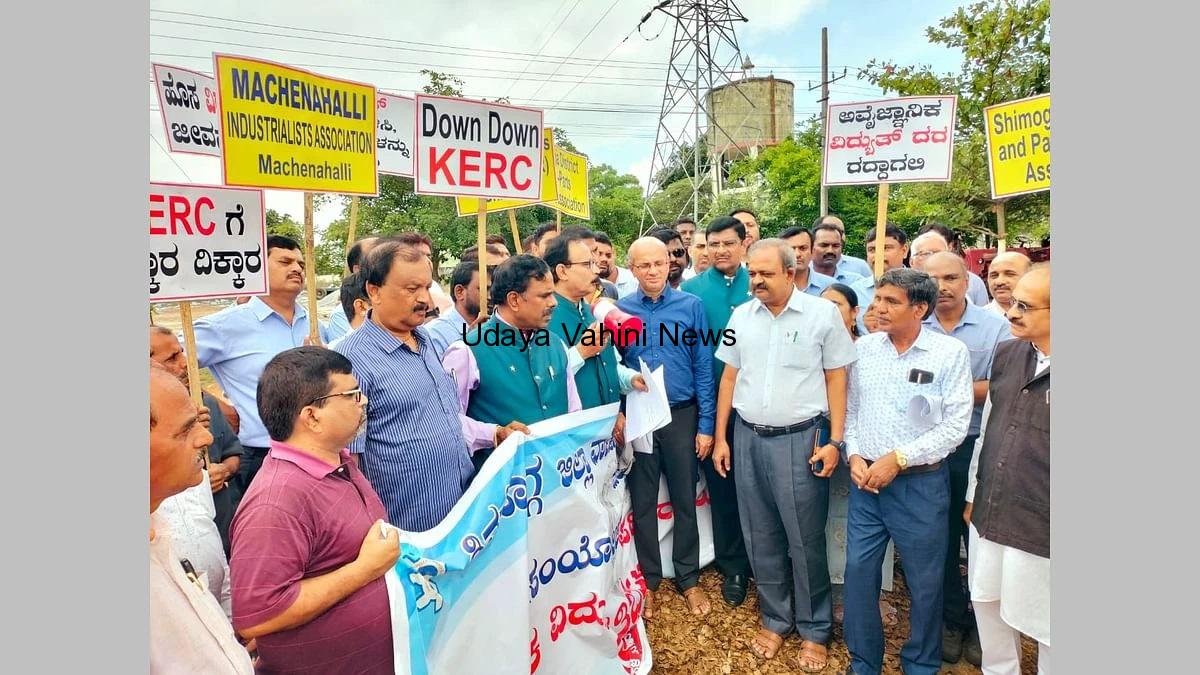 ಉದಯವಾಹಿನಿ,ಶಿವಮೊಗ್ಗ: ವಿದ್ಯುತ್ ದರ ಏರಿಕೆ ಖಂಡಿಸಿ, ರಾಜ್ಯ ವಿದ್ಯುತ್ ನಿಯಂತ್ರಣ ಆಯೋಗ (ಕೆಇಆರ್ ಸಿ) ಮತ್ತು ಮೆಸ್ಕಾಂ ವಿರುದ್ಧ ಜಿಲ್ಲಾ ವಾಣಿಜ್ಯ ಮತ್ತು ಕೈಗಾರಿಕಾ ಸಂಘದ ಸದಸ್ಯರು ಇಲ್ಲಿನ ಬೈಪಾಸ್ ರಸ್ತೆ, ಎಂಆರ್ ಎಸ್ ವೃತ್ತದ ಮೆಸ್ಕಾಂ ಕಚೇರಿ ಎದುರು ಗುರುವಾರ ಪ್ರತಿಭಟನೆ ನಡೆಸಿದರು. ನಂತರ ಜಿಲ್ಲಾಧಿಕಾರಿ ಮೂಲಕ ಮುಖ್ಯಮಂತ್ರಿ ಕಚೇರಿಗೆ ಮನವಿ ಸಲ್ಲಿಸಿದರು. ಕೈಗಾರಿಕಾ ಕ್ರಾಂತಿ ಮೂಲಕ ದೇಶದ ಅಭಿವೃದ್ಧಿ ಕನಸು ಕಾಣುತ್ತಿರುವ ಸಣ್ಣ ಮತ್ತು ಮಧ್ಯಮ ಕೈಗಾರಿಕಾ ಸಂಸ್ಥೆಗಳ ಅಳಿವು- ಉಳಿವಿನ ಪ್ರಶ್ನೆ ಉದ್ಬವಿಸಿದೆ.