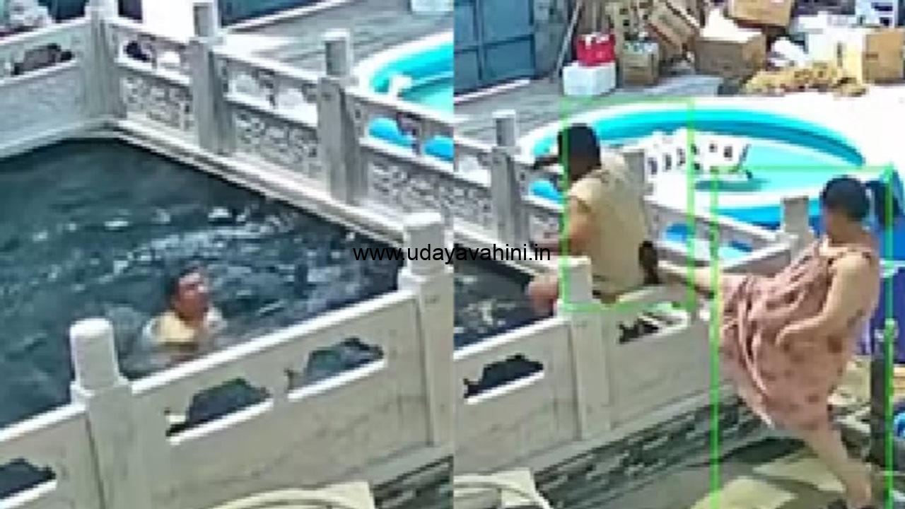 ಸಿಸಿಟಿವಿ ದೃಶ್ಯಾವಳಿಗಳಲ್ಲಿ, ಆ ವ್ಯಕ್ತಿ ಕೊಳದ ಬಳಿ ಕುಳಿತಿರುವುದನ್ನು ಕಾಣಬಹುದು. ಏನಾಗಲಿದೆ ಎಂಬುದರ ಅರಿವಿಲ್ಲದೆ ಮೀನುಗಳಿಗೆ ಆಹಾರ ಹಾಕುತ್ತಾ ಕುಳಿತಿದ್ದಾನೆ. ಕೆಲವು ಕ್ಷಣಗಳ ನಂತರ, ಅವನ ಹೆಂಡತಿ ಹಿಂದಿನಿಂದ ಬಂದು ಒದ್ದಿದ್ದಾಳೆ. ಆಕೆ ಒದ್ದ ರಭಸಕ್ಕೆ ಪತಿರಾಯ ನೇರವಾಗಿ ಕೊಳಕ್ಕೆ ಬಿದ್ದಿದ್ದಾನೆ.