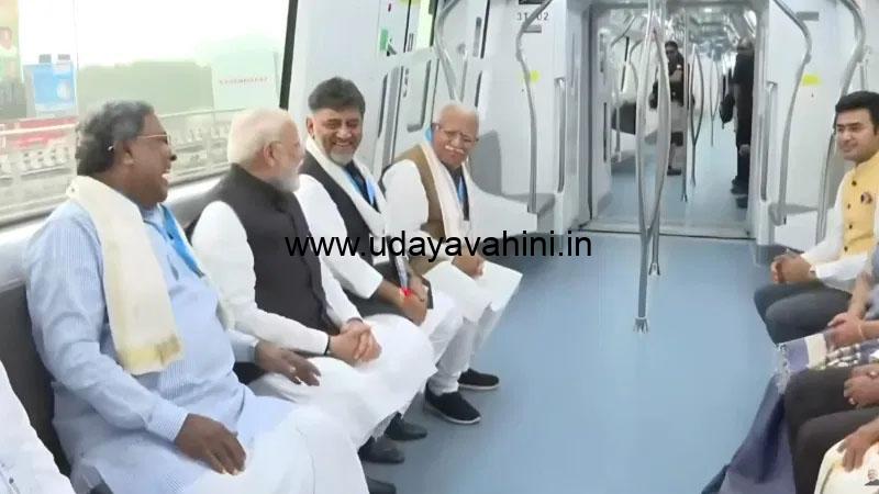 ಪ್ರಧಾನಿ ಮೋದಿ ಅವರ ಸಂದರ್ಭೋಚಿತ ಹಾಸ್ಯ ಚಟಾಕಿಗೆ ಅಲ್ಲಿದ್ದ ಎಲ್ಲರೂ ನಕ್ಕಿದ್ದಾರೆ. ಫ್ರೀ ಬಸ್ ಉಲ್ಲೇಖಿಸಿ ಮೆಟ್ರೋದಲ್ಲಿ ಮೋದಿಯವರಿಂದ ಸಿಎಂ ಡಿಸಿಎಂಗೆ ಹಾಸ್ಯದ ಮೂಲಕ ಟಾಂಗ್ ನೀಡಿದ್ದಾರೆ.ಮೆಜೆಸ್ಟಿಕ್ನಲ್ಲಿರುವ ಕ್ರಾಂತಿವೀರ ಸಂಗೊಳ್ಳಿ ರಾಯಣ್ಣ ನಿಲ್ದಾಣದಲ್ಲಿ ಮೂರು ವಂದೇ ಭಾರತ್ ರೈಲಿಗೆ ಮೋದಿ ಚಾಲನೆ ನೀಡಿದ ಬಳಿಕ ಮೆಟ್ರೋ ಉದ್ಘಾಟನೆ ಮಾಡಲು ರಾಗಿಗುಡ್ಡಕ್ಕೆ ಬಂದರು. ಹಳದಿ ಮಾರ್ಗದಲ್ಲಿ ಸಂಚರಿಸುವ ರೈಲಿಗೆ ಮೋದಿ ಚಾಲನೆ ನೀಡಿದ ಬಳಿಕ ಪ್ರಧಾನಿ, ಸಿಎಂ, ಡಿಸಿಎಂ ಮೆಟ್ರೋ ರೈಲಿನಲ್ಲಿ ಜೊತೆಯಾಗಿ ಕುಳಿತು ಕೋನಪ್ಪನ ಅಗ್ರಹಾರದವರೆಗೆ (ಇನ್ಫೋಸಿಸ್ ಫೌಂಡೇಶನ್ ಮೆಟ್ರೋ ಸ್ಟೇಷನ್) ಪ್ರಯಾಣಿಸಿದರು. ಈ ಪ್ರಯಾಣದ ವೇಳೆ ಎದುರುಗಡೆ ಬಿಜೆಪಿ ಸಂಸದರು ಕುಳಿತಿದ್ದರು.