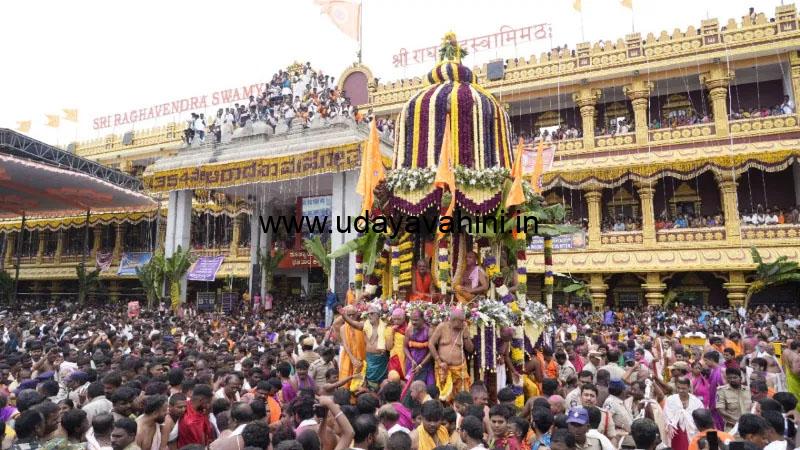 ಉದಯವಾಹಿನಿ, ರಾಯಚೂರು: ರಾಘವೇಂದ್ರ ಸ್ವಾಮಿಗಳ 354ನೇ ಆರಾಧನಾ ಮಹೋತ್ಸವದ ಕೊನೆಯ ಘಟ್ಟವಾದ ಉತ್ತರರಾಧನೆ ಮಂತ್ರಾಲಯದಲ್ಲಿ ಅದ್ದೂರಿಯಾಗಿ ನಡೆಯುತ್ತಿದೆ. ಮಠದ ರಾಜ ಬೀದಿಯಲ್ಲಿ ನಡೆದ ಮಹಾರಥೋತ್ಸವದಲ್ಲಿ ಸಹಸ್ರಾರು ಸಂಖ್ಯೆಯಲ್ಲಿ ಭಾಗವಹಿಸಿದ್ದ ಭಕ್ತರು ಆರಾಧನಾ ಸಂಭ್ರಮಕ್ಕೆ ಸಾಕ್ಷಿಯಾದರು.