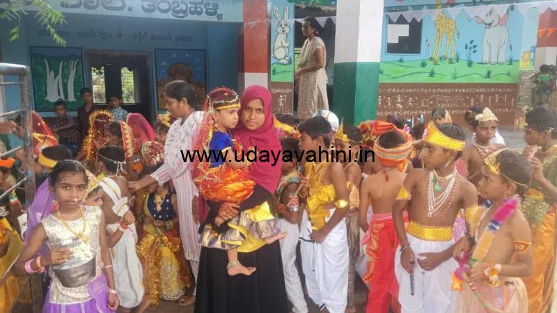 ಉದಯವಾಹಿನಿ, ಬಳ್ಳಾರಿ: ಹಿಂದೂ, ಮುಸ್ಲಿಂ ಪರಸ್ಪರ ಭಾವೈಕ್ಯತೆಯಿಂದ ರಾಷ್ಟ್ರೀಯ ಏಕತೆಯನ್ನು ಸಾರಲು ಹಗರಿಬೊಮ್ಮನಹಳ್ಳಿ ತಾಲೂಕಿನ ತಂಬ್ರಹಳ್ಳಿ ಗ್ರಾಮದ ಸರ್ಕಾರಿ ಉರ್ದು ಪ್ರಾಥಮಿಕ ಶಾಲೆಯಲ್ಲಿ ಅದ್ದೂರಿ ಶ್ರೀಕೃಷ್ಣ ಜನ್ಮಾಷ್ಟಮಿ ಆಚರಣೆ ಮಾಡಿದ್ದಾರೆ.ಕೋಮು ಸೌಹಾರ್ದತೆಯಿಂದ ಇಂತಹ ಕಾರ್ಯಕ್ರಮಗಳನ್ನು ಶಾಲೆಗಳಲ್ಲಿ ಹಮ್ಮಿಕೊಂಡು ರಾಷ್ಟ್ರೀಯ ಏಕತೆ ಮೂಡಿಸುವ ಜೊತೆಗೆ ಪರಸ್ಪರ ಭಾವೈಕ್ಯತೆಯಿಂದ ದೇಶದ ಪ್ರಗತಿಯ ಸಾಧಿಸುವ ದೃಷ್ಟಿಯಿಂದ ಶ್ರೀಕೃಷ್ಣ ಜನ್ಮಾಷ್ಟಮಿ ಆಚರಿಸಲಾಗಿದೆ. ಮುಸ್ಲಿಮ್ ಕುಟುಂಬದ ಮಕ್ಕಳು ಕೃಷ್ಣ ರಾಧೆಯರ ವೇಷ ತೊಟ್ಟು ಸಂಭ್ರಮಿಸುವ ಮೂಲಕ ಭಾವೈಕ್ಯತೆ ಸಾರಿದರು.