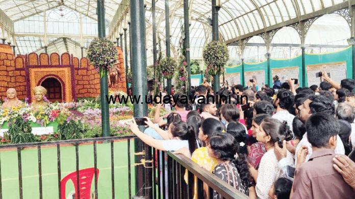 ತುಂತುರು ಮಳೆಯ ನಡುವೆಯೂ ಸಹಸ್ರಾರು ಜನರು ಸಸ್ಯಕಾಶಿಗೆ ಭೇಟಿ ನೀಡಿ, ಹೂವಿನಲ್ಲಿ ಮೂಡಿದ್ದ ಕಲಾಕೃತಿಗಳನ್ನು ವೀಕ್ಷಿಸಿ ಸಂಭ್ರಮಿಸಿದರು. ನಿನ್ನೆ ಒಂದೇ ದಿನ 37.39 ಲಕ್ಷ ಆದಾಯ ಸಂಗ್ರಹವಾಗಿದೆ. ಮಳೆಯ ನಡುವೆಯೂ 52,150 ಮಂದಿ ವಯಸ್ಕರು, 7.960 ಮಕ್ಕಳು ಭೇಟಿ ನೀಡಿದ್ದಲ್ಲದೆ ಶಾಲಾ ಸಮವಸ್ತ್ರದಲ್ಲಿ ಬಂದಿದ್ದ 7,200 ಮಕ್ಕಳಿಗೆ ಉಚಿತ ಪ್ರದರ್ಶನ ಕಲ್ಪಿಸಲಾಗಿತ್ತು. ಫಲಪುಷ್ಪ ಪ್ರದರ್ಶನಕ್ಕೆ ಅಂತಿಮ ದಿನವಾಗಿದ್ದು, ಬೆಳಿಗ್ಗೆ 9 ರಿಂದ ಸಂಜೆ 6.30ರವರೆಗೆ ಪ್ರದರ್ಶನವಿರಲಿದೆ. ವಾರದ ದಿನವಾದ್ದರಿಂದ ವಯಸ್ಕರಿಗೆ 80 ರೂ., ಮಕ್ಕಳಿಗೆ 30 ರೂ. ಶುಲ್ಕವಿರಲಿದೆ ಎಂದು ತೋಟಗಾರಿಕಾ ಇಲಾಖೆಯ ಅಧಿಕಾರಿಯೊಬ್ಬರು ತಿಳಿಸಿದ್ದಾರೆ.