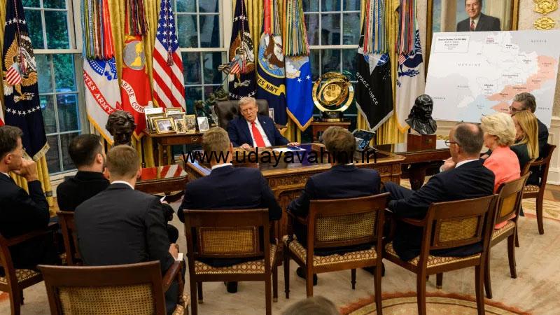 ಉದಯವಾಹಿನಿ, ವಾಷಿಂಗ್ಟನ್: ಉಕ್ರೇನ್- ರಷ್ಯಾ ಯುದ್ಧ ಕೊನೆಗೊಳಿಸಲು ಪ್ರಯತ್ನ ನಡೆಸುತ್ತಿರುವ ಅಮೆರಿಕದ ಅಧ್ಯಕ್ಷ ಡೊನಾಲ್ಡ್ ಟ್ರಂಪ್ ಈಗ ವ್ಲಾದಿಮಿರ್ ಪುಟಿನ್ ಮತ್ತು ಝೆಲೆನ್ಸ್ಕಿ ಮಾತುಕತೆಗೆ ಮಧ್ಯವರ್ತಿಯಾಗಿ ಕೆಲಸ ಮಾಡಿದ್ದಾರೆ.ಅಲಾಸ್ಕಾದಲ್ಲಿ ರಷ್ಯಾ ಅಧ್ಯಕ್ಷ ವ್ಲಾದಿಮಿರ್ ಪುಟಿನ್ ಅವರನ್ನು ಭೇಟಿಯಾಗಿದ್ದ ಅಮೆರಿಕದ ಅಧ್ಯಕ್ಷ ಡೊನಾಲ್ಡ್ ಟ್ರಂಪ್ ಈಗ ಶ್ವೇತಭವನದಲ್ಲಿ ಉಕ್ರೇನ್ ಅಧ್ಯಕ್ಷ ಝೆಲೆನ್ಸ್ಕಿ ಮತ್ತು ಯೋಪಿಯನ್ ನಾಯಕರ ಜೊತೆ ಸಭೆ ನಡೆಸಿದರು.