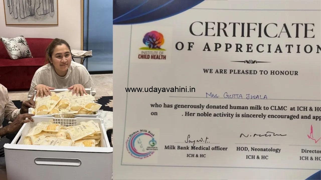 ಜ್ವಾಲಾ ಗುಟ್ಟಾ ಸರ್ಕಾರಿ ಆಸ್ಪತ್ರೆಗಳಲ್ಲಿ ಚಿಕಿತ್ಸೆ ಪಡೆಯುತ್ತಿರುವ ನವಜಾತ ಶಿಶುಗಳಿಗೆ ಎದೆ ಹಾಲು ಅನ್ನು ದಾನವಾಗಿ ನೀಡಿದ್ದಾರೆ. ಕಳೆದ ನಾಲ್ಕು ತಿಂಗಳಿನಿಂದ ಜ್ವಾಲಾ ಗುಟ್ಟಾ ಶಿಶುಗಳಿಗೆ ತಮ್ಮ ಎದೆ ಹಾಲು ಅನ್ನು ದಾನವಾಗಿ ನೀಡುತ್ತಿದ್ದಾರೆ. ತಾಯಿ ಇಲ್ಲದ ಅನಾಥ ಶಿಶುಗಳಿಗೆ ಎದೆ ಹಾಲು ಅನ್ನು ನೀಡಿ ಜ್ವಾಲಾ ಗುಟ್ಟಾ ಅನಾಥ ಶಿಶುಗಳ ಪಾಲಿಗೆ ತಾಯಿಯಾಗಿದ್ದಾರೆ.