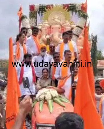 ಉದಯವಾಹಿನಿ, ದಾವಣಗೆರೆ: ನಗರದಲ್ಲಿ ಪ್ರತಿಷ್ಠಾಪಿಸಿದ್ದ ಹಿಂದೂ ಮಹಾಗಣಪತಿ ವಿಸರ್ಜನೆಯ ಶೋಭಾಯಾತ್ರೆಗೆ ಟ್ರ್ಯಾಕ್ಟರ್ ಚಾಲನೆ ಮಾಡಿ ಎಸ್ಪಿ ಉಮಾ ಪ್ರಶಾಂತ್ ಚಾಲನೆ ನೀಡಿದರು. ದಾವಣಗೆರೆಯ ಹೈಸ್ಕೂಲ್ ಮೈದಾನದಲ್ಲಿ ಹಿಂದೂ ಮಹಾ ಗಣಪತಿಯನ್ನು ಪ್ರತಿಷ್ಠಾಪನೆ ಮಾಡಲಾಗಿತ್ತು. ಇನ್ನೂ ಪೂಜೆ ಮಾಡಿ ಶೋಭಾಯಾತ್ರೆಗೆ ಚಾಲನೆ ನೀಡುತ್ತಿದ್ದಂತೆ ಭಕ್ತರು ಜೈಕಾರ ಕೂಗಿದ್ದಾರೆ. ಶೋಭಾಯಾತ್ರೆಯಲ್ಲಿ 5000ಕ್ಕೂ ಅಧಿಕ ಭಕ್ತರು ಭಾಗಿಯಾಗಿದ್ದಾರೆ. ಇನ್ನೂ ಡಿಜೆಗೆ ಅನುಮತಿ ನೀಡದ ಹಿನ್ನಲೆ ಜನ ಸಾಂಸ್ಕೃತಿಕ ಕಲಾತಂಡಗಳ ಮೊರೆ ಹೋಗಿದ್ದಾರೆ.