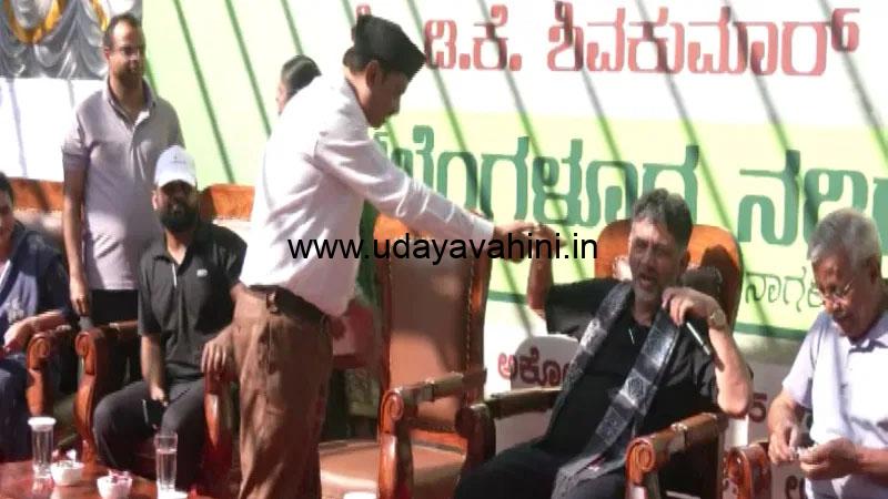 ಮುನಿರತ್ನ ಅವರು ಕಾರ್ಯಕ್ರಮದಲ್ಲಿ ಕುಳಿತಿರುವುದನ್ನು ನೋಡಿದ ಡಿಕೆಶಿ ಅವರು ಕರಿ ಟೋಪಿ ಎಂಎಎಲ್ ಬಾರಪ್ಪ ಎಂದು ವೇದಿಕೆಗೆ ಆಹ್ವಾನಿಸಿದರು. ಆಹ್ವಾನಿಸಿದ ಹಿನ್ನೆಲೆಯಲ್ಲಿ ಮುನಿರತ್ನ ವೇದಿಕೆಗೆ ಹೋಗಿ ಡಿಕೆಶಿ ಬಳಿ ಮೈಕ್ ಕೇಳಿದರು. ಆದರೆ ಡಿಕೆಶಿ ಮೈಕ್ ನೀಡದೇ ಇಲ್ಲಿ ಕುಳಿತುಕೊಳ್ಳಿ ಎಂದರು. ಇದಕ್ಕೆ ಒಪ್ಪದ ಮುನಿರತ್ನ ಮೈಕ್ ನೀಡುವಂತೆ ಕೇಳಿದರು. ಕೊನೆಗೆ ಮುನಿರತ್ನ ಅವರು ಮೈಕ್ ಪಡೆದು, ಆರ್ಎಸ್ಎಸ್ ಪಥಸಂಚಲನ ಮುಗಿಸಿ ಈ ಕಾರ್ಯಕ್ರಮಕ್ಕೆ ಹಾಜರಾಗಿದ್ದೇನೆ. ನನಗೆ ಈ ಕಾರ್ಯಕ್ರಮಕ್ಕೆ ಯಾವುದೇ ಆಹ್ವಾನ ಇಲ್ಲ. ಆದರೆ ನನ್ನ ಕ್ಷೇತ್ರದಲ್ಲಿ ನಡೆಯುತ್ತಿರುವ ಕಾರಣ ನಾನೊಬ್ಬ ಪ್ರಜೆಯಾಗಿ ಭಾಗವಹಿಸಿದ್ದೇನೆ ಎಂದು ಹೇಳಿ ವೇದಿಕೆಯಿಂದ ಇಳಿದು ಮತ್ತೆ ಜನರ ಮಧ್ಯೆ ಕುಳಿತರು. ಸಭಾ ಕಾರ್ಯಕ್ರಮದಲ್ಲಿ ನಿರೂಪಕರು ಮುನಿರತ್ನ ಅವರನ್ನು ಸ್ವಾಗಿಸಿ ವೇದಿಕೆಗೆ ಆಹ್ವಾನಿಸಿದರು. ಈ ವೇಳೆ ವೇದಿಕೆ ಏರಿದ ಮುನಿರತ್ನ, ನಾನೊಬ್ಬ ಜನಪ್ರತಿನಿಧಿಯಾಗಿದ್ದೇನೆ ನನಗೆ ಆಹ್ವಾನ ಇಲ್ಲ. ಈ ಕ್ಷೇತ್ರದ ಸಂಸದರಿಗೂ ಆಹ್ವಾನ ಇಲ್ಲ. ಇದು ಸರ್ಕಾರಿ ಕಾರ್ಯಕ್ರಮವೇ ಅಥವಾ ಕಾಂಗ್ರೆಸ್ ಪಕ್ಷದ ಕಾರ್ಯಕ್ರಮವೇ ಎಂದು ಅಧಿಕಾರಿಗಳನ್ನು ಪ್ರಶ್ನಿಸಿ ಅಸಮಾಧಾನ ಹೊರಹಾಕಿದರು. ಮುನಿರತ್ನ ಆಕ್ರೋಶ ಹೊರ ಹಾಕುತ್ತಿದ್ದಂತೆ ಅಧಿಕಾರಿಗಳು ಮತ್ತು ಪೊಲೀಸರು ಮುನಿರತ್ನ ಅವರನ್ನು ಸುತ್ತುವರೆದು ಮೈಕ್ ಪಡೆದುಕೊಂಡರು.