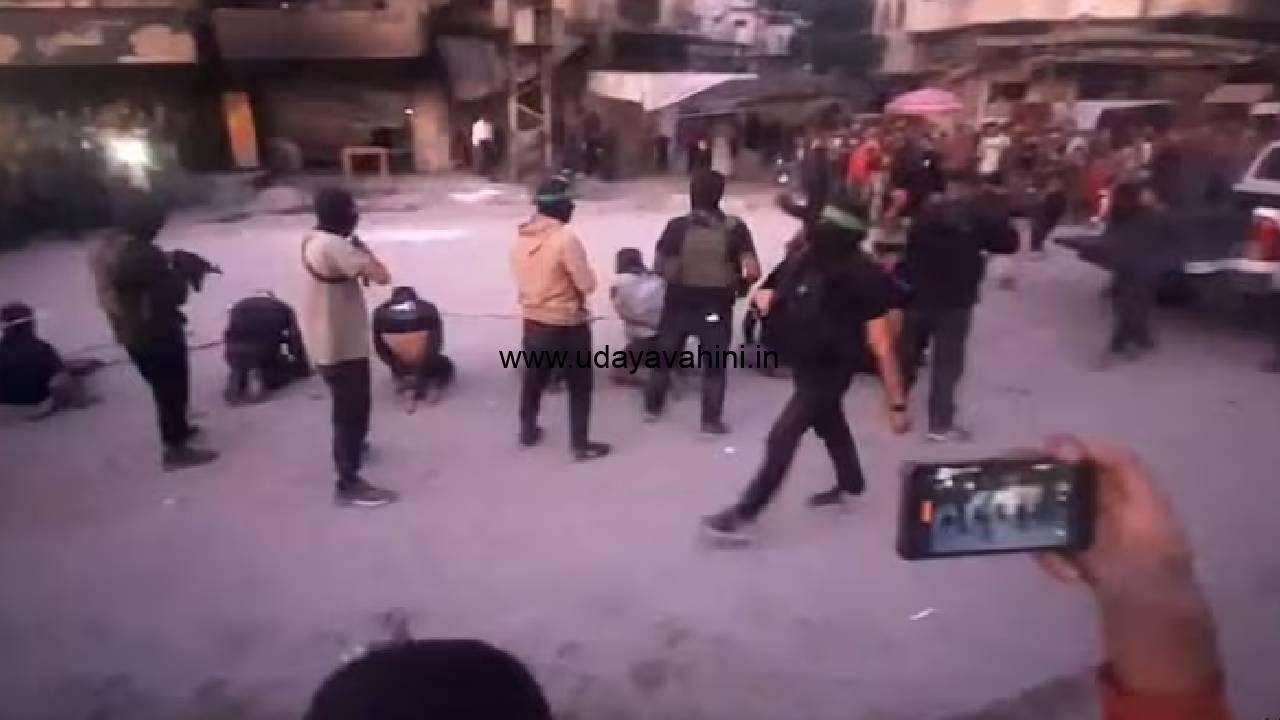 ಸೋಮವಾರ ಸಂಜೆ ಹಮಾಸ್ ಉಗ್ರರು ಬರೋಬ್ಬರಿ ಎಂಟು ಜನರನ್ನು ಸಾರ್ವಜನಿಕವಾಗಿ ಗುಂಡು ಹಾರಿಸಿ ಬರ್ಬರವಾಗಿ ಹತ್ಯೆ ಮಾಡಿದ್ದಾರೆ. ವೈರಲಾಗುತ್ತಿರುವ ವಿಡಿಯೊದಲ್ಲಿ, ಹಮಾಸ್ಗೆ ಸಂಬಂಧಿಸಿದ ಹಸಿರು ಹೆಡ್ಬ್ಯಾಂಡ್ ಧರಿಸಿದ ಬಂದೂಕುಧಾರಿಗಳು ಕಣ್ಣಿಗೆ ಬಟ್ಟೆ ಕಟ್ಟಿ ರಸ್ತೆಯಲ್ಲಿ ಕೂರಿಸಿರುವ ಎಂಟು ಜನರನ್ನು ಮೊದಲಿಗೆ ಬರ್ಬರವಾಗಿ ಥಳಿಸುತ್ತಾರೆ. ನಂತರ ಗುಂಡು ಹಾರಿಸಿ ಹತ್ಯೆ ಮಾಡುವುದನ್ನು ಕಾಣಬಹುದಾಗಿದೆ. ಶವಗಳ ಸುತ್ತ ಉಗ್ರರು ‘ಅಲ್ಲಾಹು ಅಕ್ಬರ್’ (ಅರೇಬಿಕ್ನಲ್ಲಿ ದೇವರು ಶ್ರೇಷ್ಠ) ಎಂದು ಜೋರಾಗಿ ಕಿರುಚಾಡಿದ್ದಾರೆ. ಘೋಷಣೆಗಳು ಕೇಳಿಬರುತ್ತಿವೆ.ಕೆಲವು ಹೋರಾಟಗಾರರು ಕೆಲವು ಕೈದಿಗಳನ್ನು ಗಲ್ಲಿಗೇರಿಸಲು ಸಾಲಾಗಿ ನಿಲ್ಲಿಸಿದಾಗ ಅವರನ್ನು ಹೊಡೆಯುತ್ತಿರುವುದು ಕಂಡುಬರುತ್ತದೆ.