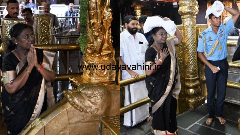 ಸೋಮವಾರದಿಂದ ಸಂಜೆ 6:20ರ ಸುಮಾರಿಗೆ ತಿರುವನಂತಪುರಂಕ್ಕೆ ಆಗಮಿಸಿದ ಮುರ್ಮು ಅವರಿಂದು ಹೆಲಿಕಾಪ್ಟರ್ ಮೂಲಕ ಕೇರಳದ ಪ್ರಮಾಡಂ ಇನ್ಡೋರ್ ಸ್ಟೇಡಿಯಂಗೆ ಬಂದಿಳಿದರು, ಈ ವೇಳೆ ಹೆಲಿಕಾಪ್ಟರ್ ಟೈರ್ ಕಾಂಕ್ರೀಟ್ನಲ್ಲಿ ಹೂತುಹೋಯಿತು. ಬಳಿಕ ಅಗ್ನಿಶಾಮಕ ಸಿಬ್ಬಂದಿ ಹೆಲಿಕಾಪ್ಟರ್ನ್ನು ತಳ್ಳಿ ಬದಿಸರಿಸಿದರು. ನಂತರ ಅಲ್ಲಿಂದ ಶಬರಿಮಲೆಗೆ ತೆರಳಿ ತುಲಾ ಮಾಸ ಪೂಜೆಯ ಕೊನೆಯ ದಿನದಂದು ಅಯ್ಯಪ್ಪ ಸ್ವಾಮಿಯ ದರ್ಶನ ಪಡೆದಿದ್ದಾರೆ.