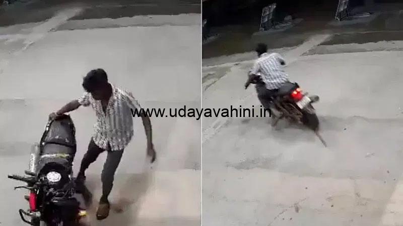 ಪೆಟ್ರೋಲ್ ಬಂಕ್ವೊಂದರಲ್ಲಿ ರಾತ್ರಿ ವೇಳೆ ಬೈಕ್ ಸವಾರ ಪೆಟ್ರೋಲ್ ಹಾಕಿಸಿದ್ದಾನೆ. ಆತ ಕುಡಿದ ಮತ್ತಿನಲ್ಲಿದ್ದಂತೆ ವರ್ತಿಸಿದ್ದಾನೆ. ಸ್ಟ್ಯಾಂಡ್ ಹಾಕಿದ್ದ ಬೈಕನ್ನು ಹಾಗೆಯೇ ತಿರುಗಿಸಿ ಸ್ಟಾರ್ಟ್ ಮಾಡಿಕೊಂಡು ಅಡ್ಡಾದಿಡ್ಡಿ ಬೈಕ್ ಚಲಾಯಿಸಿರುವುದು ಕಂಡುಬಂದಿದೆ.