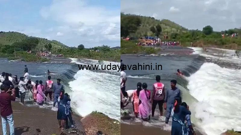 ಒಂದೇ ವರ್ಷದಲ್ಲಿ ಸತತ ಎರಡನೇ ಬಾರಿಗೆ ಕೋಡಿ ಬಿದ್ದಿರುವ ಬರದನಾಡಿನ ಜೀವನಾಡಿ ವಿವಿಸಾಗರ ಜಲಾಶಯದ ಕೋಡಿನೀರು ವೀಕ್ಷಿಸಲು ನಿತ್ಯ ಸಾವಿರಾರು ಜನ ಪ್ರವಾಸಿಗರು ದೌಡಾಯಿಸುತ್ತಿದ್ದಾರೆ. ಈ ವೇಳೆ ಯುವಕನೋರ್ವ ಹುಚ್ಚು ಸಾಹಸಕ್ಕೆ ಮುಂದಾಗಿದ್ದು, ಆಯತಪ್ಪಿ ಹರಿಯುವ ನೀರಲ್ಲಿ ಕೊಚ್ಚಿಕೊಂಡು ಹೋಗಿದ್ದ. ಆದರೆ ಅಲ್ಲಿನ ಸಾರ್ವಜನಿಕರು ಹಾಗು ಪೊಲೀಸರ ಸಮಯಪ್ರಜ್ಞೆಯಿಂದ ಹಗ್ಗದ ಸಹಾಯದೊಂದಿಗೆ ಪ್ರಾಣಾಪಾಯದಿಂದ ಯುವಕ ಸೇಫಾಗಿ ದಡ ಸೇರಿದ್ದಾನೆ.