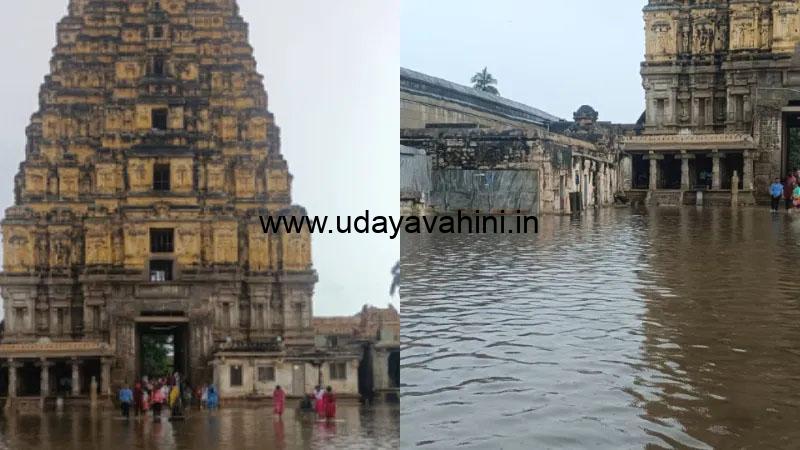 ಉದಯವಾಹಿನಿ, ಬಳ್ಳಾರಿ: ವಿಜಯನಗರ ಜಿಲ್ಲೆಯಲ್ಲಿ ಕಳೆದ ಒಂದು ವಾರದಿಂದ ನಿರಂತರವಾಗಿ ಮಳೆಯಾಗುತ್ತಿದೆ. ಇದರಿಂದ ಹಂಪಿಯ ವಿರೂಪಾಕ್ಷ ದೇವಾಲಯದ ಆವರಣದಲ್ಲಿ ಮಳೆ ನೀರು ನಿಂತಿದ್ದು, ಜನರು ಹೈರಾಣಾಗುತ್ತಿದ್ದಾರೆ. ಐತಿಹಾಸಿಕ ಹಂಪಿಯ ಶ್ರೀ ವಿರೂಪಾಕ್ಷ ದೇಗುಲದ ಆವರಣದಲ್ಲಿ ಮಳೆಯಿಂದಾಗಿ ಮೊಣಕಾಲುದ್ಧ ನೀರು ನಿಂತಿದೆ. ಪರಿಣಾಮ ದೇವಸ್ಥಾನಕ್ಕೆ ಬರುವ ಭಕ್ತರು ಹಾಗೂ ಪ್ರವಾಸಿಗರಿಗೆ ಸಮಸ್ಯೆ ಎದುರಾಗಿದೆ. ಬೇರೆ ದಾರಿಯಿಲ್ಲದೇ ಪ್ರವಾಸಿಗರು ನಿಂತ ನೀರಿನಲ್ಲಿಯೇ ನಡೆದುಕೊಂಡು ಹೋಗಿ, ವಿರೂಪಾಕ್ಷೇಶ್ವರನ ದರ್ಶನ ಪಡೆದಿದ್ದಾರೆ. ಮಳೆ ಬಂದಾಗ ನೀರು ಹೊರಹೋಗುವ ವ್ಯವಸ್ಥೆ ಮಾಡಬೇಕಿದ್ದ ಅಧಿಕಾರಿಗಳು ನಿರ್ಲಕ್ಷ್ಯ ವಹಿಸಿದ್ದರಿಂದ ಪ್ರವಾಸಿಗರು ಹಿಡಿಶಾಪ ಹಾಕುತ್ತಿದ್ದಾರೆ.