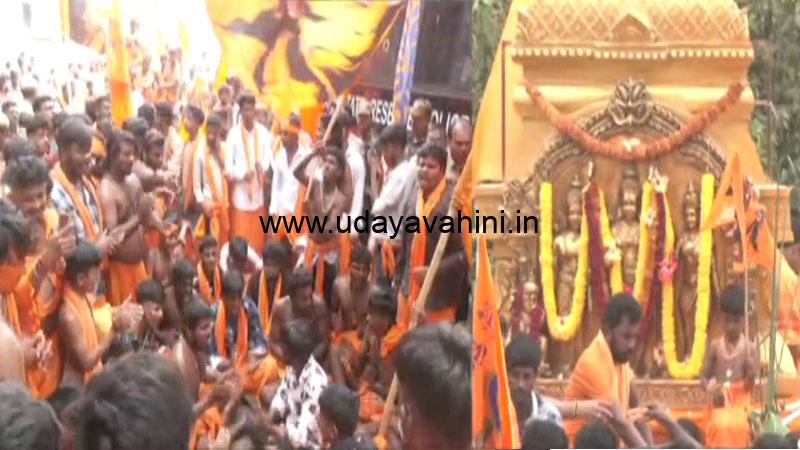 ಹನುಮ ಧ್ವಜ ಹಿಡಿದ ಸಾವಿರಾರು ಭಕ್ತರು ಕೂಡ ಯಾತ್ರೆಯಲ್ಲಿ ಭಾಗಿಯಾಗಿದ್ರು. ಗಂಜಾಂನ ಹಜರತ್ ಸೈಯದ್ ಜವಾರ್ ದರ್ಗಾದ ಮುಂದೆ ಹನುಮ ಮಾಲಾಧಾರಿಗಳ ಯಾತ್ರೆ ಸಾಗಿಬಂದು ಜಾಮೀಯಾ ಮಸೀದಿ ತಲುಪಿತ್ತು. ಈ ವೇಳೆ ಸಂಕೀರ್ತನ ಯಾತ್ರೆ. ಜಾಮೀಯಾ ಮಸೀದಿ ಕಡೆಗೆ ನುಗ್ಗಲು ಮಾಲಧಾರಿಗಳು ಯತ್ನಿಸಿದ್ರು. ಇದರಿಂದ ಮಾಲಧಾರಿಗಳು ಹಾಗೂ ಪೊಲೀಸರ ನಡುವೆ ತಳ್ಳಾಟ-ನೂಕಾಟ ನಡೆಯಿತು. ಸಂಕೀರ್ತನಾ ಯಾತ್ರೆ ಜಾಮೀಯಾ ಮಸೀದಿ ತಲುಪಿದಂತೆ ಮಸೀದಿ ಬಳಿ ಜೈ ಶ್ರೀರಾಮ್, ಜೈ ಹನುಮಾನ್, ನಾವೆಲ್ಲಾ ಒಂದು ನಾವೇಲ್ಲಾ ಹಿಂದೂ.. ಹನುಮನ ಪಾದದ ಮೇಲಾಣೆ ಮಂದಿರವಿಲ್ಲೇ ಕಟ್ಟುವೆವುʼ ಎಂದು ಘೋಷಣೆ ಕೇಳಿಬಂದಿದೆ. ಮಸೀದಿ ಬಳಿಯ ವೃತ್ತದಲ್ಲಿ ನಿಂಬೆ ಹಣ್ಣು ಇಟ್ಟು ಕರ್ಪೂರ ಹಚ್ಚಿದ ಮಾಲಧಾರಿಗಳು… ಆ ಜಾಗ ನಮ್ಮದು ಎಂದು ಘೋಷಣೆʼ ಕೂಗಿದ್ದಾರೆ.