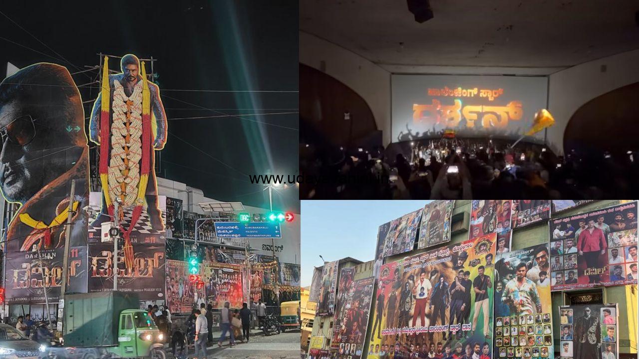 ಉದಯವಾಹಿನಿ, ಚಾಲೆಂಜಿಂಗ್ ಸ್ಟಾರ್ ದರ್ಶನ್ ಅಭಿನಯದ ಡೆವಿಲ್ ಸಿನಿಮಾ ಅದ್ಧೂರಿಯಾಗಿ ತೆರೆಗೆ ಬಂದಿದೆ. ಅಭಿಮಾನಿಗಳಲ್ಲಿ ಹಬ್ಬ ಜೋರಾಗಿದೆ. ಮೆಚ್ಚಿನ ನಟನನ್ನು ನೋಡಿ ಸಖತ್ ಖುಷ್ ಆಗಿದ್ದಾರೆ. ಮುಂಜಾನೆ 6.30ರಿಂದ ಶೋಗಳು ಆರಂಭ ಆಗಿವೆ. ಎಲ್ಲಾ ಶೋಗಳು ಹೌಸ್ಫುಲ್ ಆಗಿವೆ. ಮಲ್ಟಿಪ್ಲೆಕ್ಸ್ಗಳಲ್ಲಿಯೂ ಸಿನಿಮಾನ ದೊಡ್ಡ ಸಂಖ್ಯೆಯಲ್ಲಿ ವೀಕ್ಷಣೆ ಮಾಡುತ್ತಿದ್ದಾರೆ. ದರ್ಶನ್ ಕಟೌಟ್ಗೆ ಹಾಲಿನ ಅಭಿಷೇಕ ಮಾಡುತ್ತಿದ್ದಾರೆ.