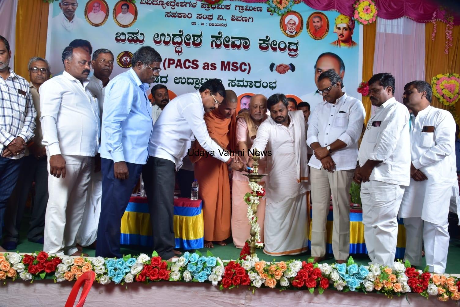 ಪಟ್ಟಣದ ಸಮೀಪವಿರುವ ಶಿವಣಗಿ ಗ್ರಾಮದ ವಿವಿಧೋದ್ದೇಶಗಳ ಪ್ರಾಥಮಿಕ ಗ್ರಾಮೀಣ ಕೃಷಿ ಸಹಕಾರ ಸಂಘದ ವತಿಯಿಂದ ಹಮ್ಮಿಕೊಂಡಿದ್ದ ಬಹು ಉದ್ದೇಶ ಸೇವಾಕೇಂದ್ರದ ಉದ್ಘಾಟನಾ ಸಮಾರಂಭದ ದಿವ್ಯಸಾನಿಧ್ಯ ವಹಿಸಿ ಮಾತನಾಡುತ್ತಿದ್ದರು.ಈ ಸಂದರ್ಭದಲ್ಲಿ ಕಾರ್ಯಕ್ರಮದ ಮುಖ್ಯ ಅತಿಥಿ ಸ್ಥಾನವನ್ನು ವಹಿಸಿದ್ದ ನಾಗಠಾಣ ಮತಕ್ಷೇತ್ರದ ಜನಪ್ರೀಯ ಶಾಸಕರಾದ ವಿಠ್ಠಲ ಕಟಕದೊಂಡ ಅವರು ಮಾತನಾಡುತ್ತಾ ರೈತಸ್ನೇಹಿಯಾಗಿ ಕೃಷಿ ಪತ್ತಿನ ಸಹಕಾರಿ ಸಂಘಗಳು ಕಾರ್ಯ ನಿರ್ವಹಿಸಿದಾಗ ಮಾತ್ರ ರೈತರ ಹಾಗೂ ಬ್ಯಾಂಕಿನ ಅಭಿವೃದ್ಧಿ ಸಾಧ್ಯ ಹಾಗೂ ಈ ಬ್ಯಾಂಕು ನಾಡಿನ ಪ್ರಮುಖ ರೈತಸ್ನೇಹಿ ಬ್ಯಾಂಕಾಗಿ ಹೆಸರಾಗಲಿ ಎಂದು ಹಾರೈಸಿದರು.ಪ್ರಾಸ್ತಾವಿಕವಾಗಿ ಡಿಸಿಸಿ ಬ್ಯಾಂಕಿನ ನಿವೃತ್ತ ಅಧಿಕಾರಿಗಳು ಹಾಗೂ ತರಬೇತಿ ಸಂಯೋಜಕರಾದ ಆರ್ ಎಮ್ ಬಣಕಾರ ಅವರು ಮಾತನಾಡಿದರು.ವಿಶೇಷ ಅತಿಥಿಗಳಾಗಿ ಆಗಮಿಸಿದ್ದ ಬಂಥನಾಳದ ವೃಷಭಲಿಂಗೇಶ್ವರ ಸಂಸ್ಥಾನ ಮಠದ ಶ್ರೀ ವೃಷಭಲಿಂಗೇಶ್ವರ ಮಹಾಸ್ವಾಮಿಗಳು, ಕನ್ನೊಳ್ಳಿ ಹಿರೇಮಠದ ಸಿದ್ದಲಿಂಗ ಶಿವಾಚಾರ್ಯರು,ದೇವರಹಿಪ್ಪರಗಿ ಮತಕ್ಷೇತ್ರದ ಶಾಸಕರಾಗಿರುವ ರಾಜುಗೌಡ ಪಾಟೀಲ ಕುದುರಿ ಸಾಲವಾಡಗಿ ಹಾಗೂ ವಿಜಯಪುರದ ಡಿಸಿಸಿ ಬ್ಯಾಂಕ್ ಉಪಾಧ್ಯಕ್ಷರಾಗಿರುವ ರಾಜಶೇಖರ ಗುಡದಿನ್ನಿ ಅವರುಗಳು ಮಾತನಾಡಿ ಉತ್ತರೋತ್ತರವಾಗಿ ಬ್ಯಾಂಕು ಅಭಿವೃದ್ಧಿ ಹೊಂದಲಿ ಎಂದು ಶುಭ ಹಾರೈಸಿ ಸಲಹೆ ಸೂಚನೆಗಳನ್ನು ನೀಡಿದರು. ಹೊಸದಾಗಿ ಪ್ರಾರಂಭವಾದ ಬಹು ಉದ್ದೆಶ ಸೇವಾಕೇಂದ್ರವನ್ನು ನಾಗಠಾಣ ಶಾಸಕರಾಗಿರುವ ವಿಟ್ಠಲ ಕಟಕದೊಂಡ ಅವರು ಉದ್ಘಾಟಿಸಿದರು. ಸಹಕಾರಿ ಧ್ವಜಾರೋಹಣವನ್ನು ಡಿಸಿಸಿ ಬ್ಯಾಂಕಿನ ಡಿಜಿಎಮ್ ಆಗಿರುವ ಸತೀಶ್ ಡಿ ಪಾಟೀಲ ಅವರು ನೆರವೇರಿಸಿದರು.ರಾಜಶೇಖರ ಗುಡದಿನ್ನಿ ಅವರು ಜ್ಯೋತಿ ಬೆಳಗಿಸುವದರ ಮೂಲಕ ಕಾರ್ಯಕ್ರಮಕ್ಕೆ ಚಾಲನೆ ನೀಡಿದರು. ಈ ಕಾರ್ಯಕ್ರಮದ ಅಧ್ಯಕ್ಷತೆಯನ್ನು ಪಿಕೆಪಿಎಸ್ ಅಧ್ಯಕ್ಷರಾದ ರವಿ ಈ ಜೇವರಗಿಯವರು ವಹಿಸಿದ್ದರು. ಇದೇ ಸಂದರ್ಭದಲ್ಲಿ ಸಂಘದ ನಿರ್ದೇಶಕರಾದ ವಾಯ್ ಎಸ್ ಕಂಬಾರ,ಡಿ ಸಿ ಬಿರಾದಾರ,ಎಸ್ ಎಸ್ ರೆಡ್ಡಿ ಜೆ ಕೆ ಕೊರಬು,ಬಿ ಎ ಹೆಬ್ಬಾಳ,ಪಿ ಎಮ್ ದೊಡಮನಿ,ಶ್ರೀಶೈಲ ಹದರಿ,ವಿರುಪಾಕ್ಷಿ ರೋಡಗಿ ಸೇರಿದಂತೆ ನೂರಾರು ಗ್ರಾಮಸ್ಥರು, ರೈತರು ಉಪಸ್ಥಿತರಿದ್ದರು.ಪಿ ಕೆ ಸುಬಾನಪ್ಪಗೋಳ ಅವರು ಕಾರ್ಯಕ್ರಮವನ್ನು ನಿರೂಪಿಸಿದರೆ,ಕ್ಷೇತ್ರಾಧಿಕಾರಿಗಳಾದ ಶ್ರೀಮತಿ ಆರ್ ವಿ ಗುಣದಾಳಮಠ ಅವರು ವಂದಿಸಿದರು.