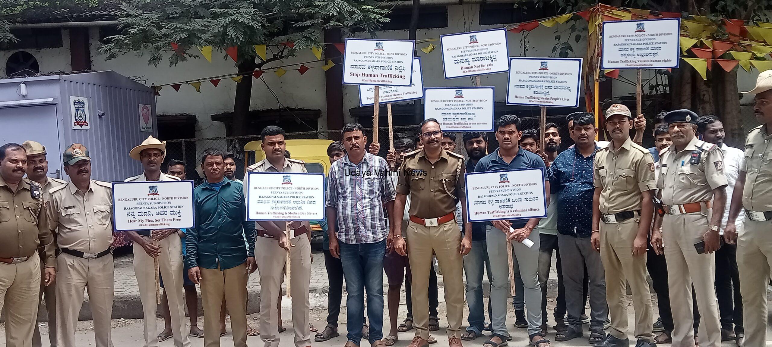 ಉದಯವಾಹಿನಿ ಪೀಣ್ಯ ದಾಸರಹಳ್ಳಿ: ಕ್ಷೇತ್ರದ ರಾಜಗೋಪಾಲನಗರ ಪೊಲೀಸ್ ಠಾಣಾ ಪೊಲೀಸರಿಂದ ಮಾನವ ಕಳ್ಳ ಸಾಗಾಣಿಕೆ ಜಾಗೃತಿಯ ಪೀಠಿಕೆಗಳ ವಿವರ :- ಮಾನವನ ಕಳ್ಳ ಸಾಗಣೆ’ ‘ಮನುಷ್ಯ ಮಾರಾಟಕ್ಕಿಲ್ಲ’ ಮಾನವ ಕಳ್ಳ ಸಾಗಾಣಿಕೆಯನ್ನು ತಡೆಯುವುದು ನಮ್ಮ ಗುರಿ’ ‘ಮಾನವ ಕಳ್ಳ ಸಾಗಾಣಿಕೆ ಜನರ ಜೀವನವನ್ನು ಕದಿಯುತ್ತಿದೆ’ ಮಾನವ ಕಳ್ಳ ಸಾಗಾಣಿಕೆ ಒಂದು ಗುರುತರ ಅಪರಾಧ’ ಮಾನವ ಕಳ್ಳ ಸಾಗಾಣಿಕೆ ಮಾನವ ಹಕ್ಕುಗಳನ್ನು ಉಲ್ಲಂಘಸುತ್ತದೆ’ ‘ಮಾನವ ಕಳ್ಳ ಸಾಗಾಣಿಕೆ ನಿಲ್ಲಿಸಿ ಒಟ್ಟಾಗಿ ಮಾನವ ಕಳ್ಳ ಸಾಗಾಣಿಕೆಯನ್ನು ಎದುರಿಸೋಣ’ ಎಂದು ಘೋಷಣೆದೊಂದಿಗೆ ಇಂದು ಪೀಣ್ಯ 2ನೇ ಹಂತ ಬಸ್ ನಿಲ್ದಾಣದಲ್ಲಿ ಜನರಿಗೆ ಅರಿವು ಮೂಡಿಸುವ ಕಾರ್ಯವನ್ನು ರಾಜಗೋಪಾಲನಗರ ಪೋಲೀಸ್ ಠಾಣಾ ಅಧಿಕಾರಿಗಳು ಪೊಲೀಸರು ವರ್ಗದವರು ಭಾಗವಹಿಸಿ ಜನರಿಗೆ ಜಾಗೃತಿ ಮೂಡಿಸಿದರು ಈ ಜಾಗೃತಿಯಲ್ಲಿ ಸಾರ್ವಜನಿಕರು ಇದ್ದರು.