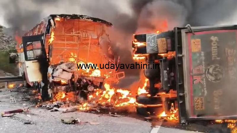 ಉದಯವಾಹಿನಿ, ಅಮರಾವತಿ: ಖಾಸಗಿ ಬಸ್ವೊಂದು ಟಿಪ್ಪರ್ಗೆ ಡಿಕ್ಕಿಯಾಗಿ ಹೊತ್ತಿ ಉರಿದ ಪರಿಣಾಮ, ಅದರಲ್ಲಿದ್ದ ಕನಿಷ್ಠ 12 ಮಂದಿ ಸಜೀವ ದಹನವಾಗಿ, 20 ಜನರು ಗಾಯಗೊಂಡಿರುವ ದುರ್ಘಟನೆ ಆಂಧ್ರಪ್ರದೇಶದ ಮಾರ್ಕಪುರಂ ಜಿಲ್ಲೆಯಲ್ಲಿ ಗುರುವಾರ ಬೆಳಗ್ಗೆ ನಡೆದಿದೆ.