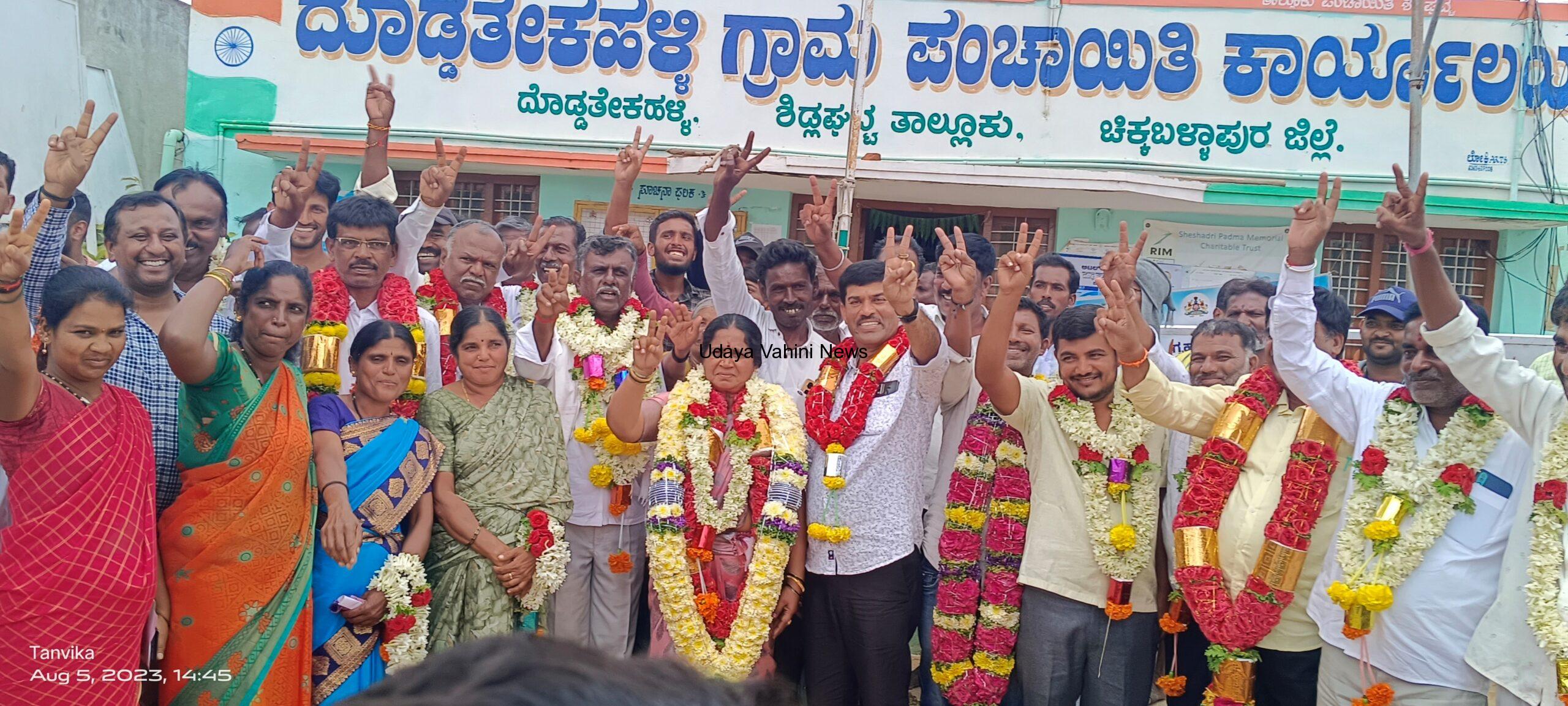 ಉದಯವಾಹಿನಿ,ಶಿಡ್ಲಘಟ್ಟ :ತಾಲ್ಲೂಕಿನ ದೊಡ್ಡತೇಕಹಳ್ಳಿ ಗ್ರಾಮ ಪಂಚಾಯತಿಯ ಎರಡನೇ ಅವಧಿಗೆ ನಡೆದ ಚುನಾವಣೆಯಲ್ಲಿ ಸಾಮಾನ್ಯ ಮಹಿಳಾ ಅಧ್ಯಕ್ಷೆಯಾಗಿ ಲಕ್ಷ್ಮಮ್ಮಬೈರಾರೆಡ್ಡಿ ಹಾಗೂ ಉಪಾಧ್ಯಕ್ಷ ಸ್ಥಾನಕ್ಕಾಗಿ ಸಾಮಾನ್ಯ ಅಭ್ಯರ್ಥಿಯಾಗಿ ಡಿ ಸಿ ಮಂಜುನಾಥ್ ಜಯಶೀಲರಾಗಿದ್ದಾರೆ.