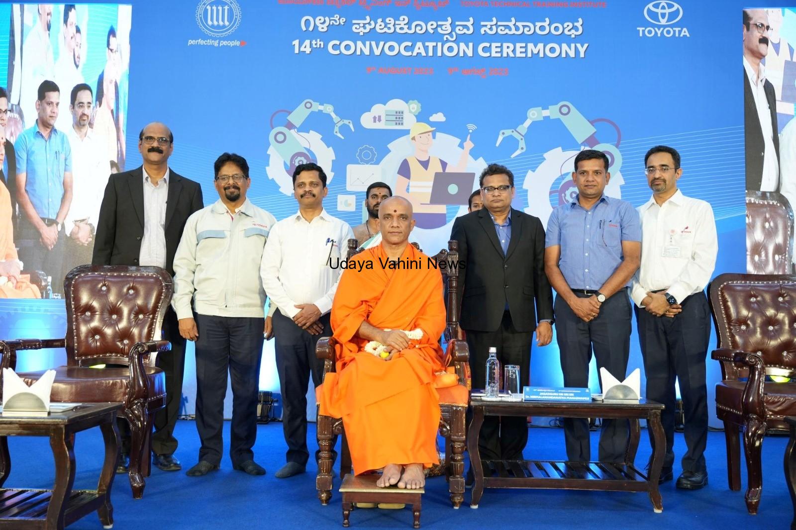 ತರಬೇತಿಯನ್ನು ಯಶಸ್ವಿಯಾಗಿ ಪೂರ್ಣಗೊಳಿಸಿದ ಗ್ರಾಮೀಣ ಕರ್ನಾಟಕದ 62 ಟಿಟಿಟಿಐ ರೆಗ್ಯುಲರ್ ವಿದ್ಯಾರ್ಥಿಗಳು ಮತ್ತು 41 ಟೊಯೊಟಾ ಕೌಶಲ ಕೋರ್ಸ್ ವಿದ್ಯಾರ್ಥಿಗಳಿಗೆ ಜಾಗತಿಕ ಉತ್ಪಾದನಾ ವಿಧಾನಗಳ ಸಮಗ್ರ ಕೌಶಲ್ಯದ ಪ್ರಮಾಣ ಪತ್ರಗಳನ್ನು ವಿತರಣೆ ಮಾಡಲಾಯಿತು.ಕಾರ್ಯಕ್ರಮದ ದಿವ್ಯ ಸಾನಿಧ್ಯ ವಹಿಸಿದ್ದ ಆದಿ ಚುಂಚನಗಿರಿ ಪೀಠಾಧ್ಯಕ್ಷರಾದ ಡಾ.ನಿರ್ಮಲಾನಂದನಾಥ ಮಹಾಸ್ವಾಮಿಜಿ ಮಾತನಾಡಿ, ಹಾರ್ದಿಕ ದೃಷ್ಟಿಯಲ್ಲಿ ಸದೃಢ ಭಾರತವನ್ನು ನಿರ್ಮಾಣ ಮಾಡುವ ನಿಟ್ಟಿನಲ್ಲಿ ಟೊಯೋಟಾ ಸಂಸ್ಥೆಯು ಒಂದು ಭಾಗವಾಗಿ ಕೆಲಸ ಮಾಡುತ್ತಿದೆ ಗ್ರಾಮೀಣ ಭಾಗದ ವಿದ್ಯಾರ್ಥಿಗಳಲ್ಲಿನ ತಾಂತ್ರಿಕ ಕೌಶಲ್ಯವನ್ನು ಗುರುತಿಸುವ ನಿಟ್ಟಿನಲ್ಲಿ ವಿಶ್ವ ದರ್ಜೆಯ ತರಬೇತಿ ನೀಡುತ್ತಿರುವುದು ಶ್ಲಾಘನೀಯವಾದದ್ದು ಎಂದು ಮೆಚ್ಚುಗೆ ವ್ಯಕ್ತಪಡಿಸಿದರು