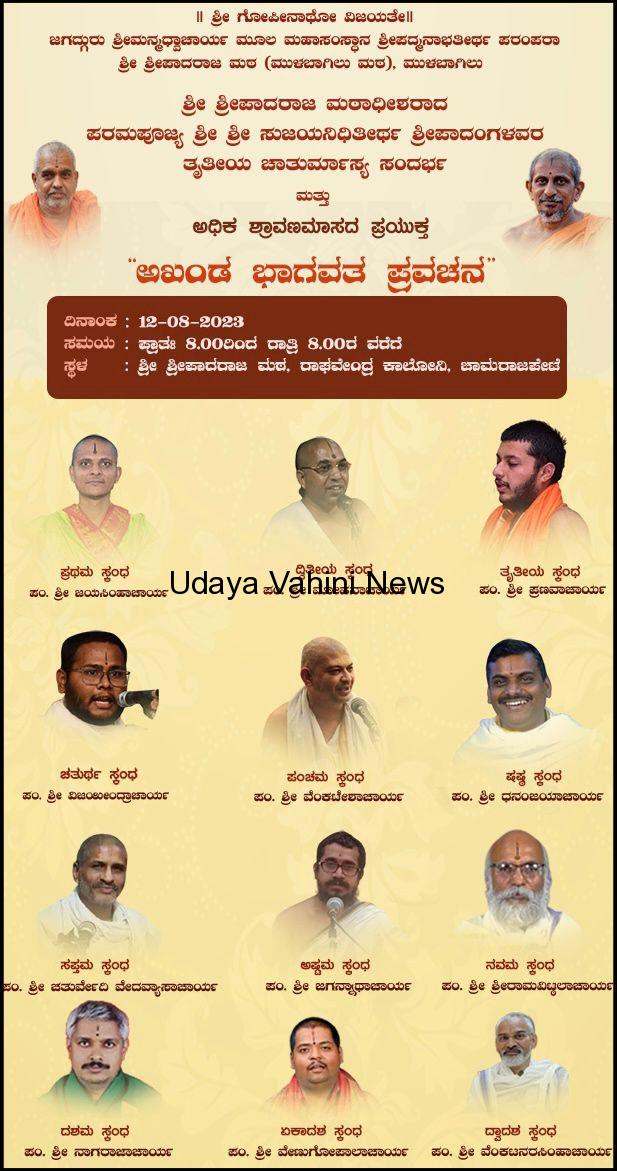 ಉದಯವಾಹಿನಿ ಬೆಂಗಳೂರು : ಮುಳಬಾಗಿಲು ಶ್ರೀಪಾದರಾಜ ಮಠಾಧೀಶರಾದ ಶ್ರೀ 1008ಶ್ರೀ ಸುಜಯನಿಧಿ ತೀರ್ಥರ ತೃತೀಯ ಚಾತುರ್ಮಾಸದ ಅಂಗವಾಗಿ ಅಧಿಕ ಶ್ರಾವಣ ಮಾಸದ ಪ್ರಯುಕ್ತ ಅಖಂಡ ಭಾಗವತ ಪ್ರವಚನ. ವನ್ನು ಇದೇ 12-8-23ರ ಶನಿವಾರದಂದು ಆಯೋಜಿಸಲಾಗಿದೆ,