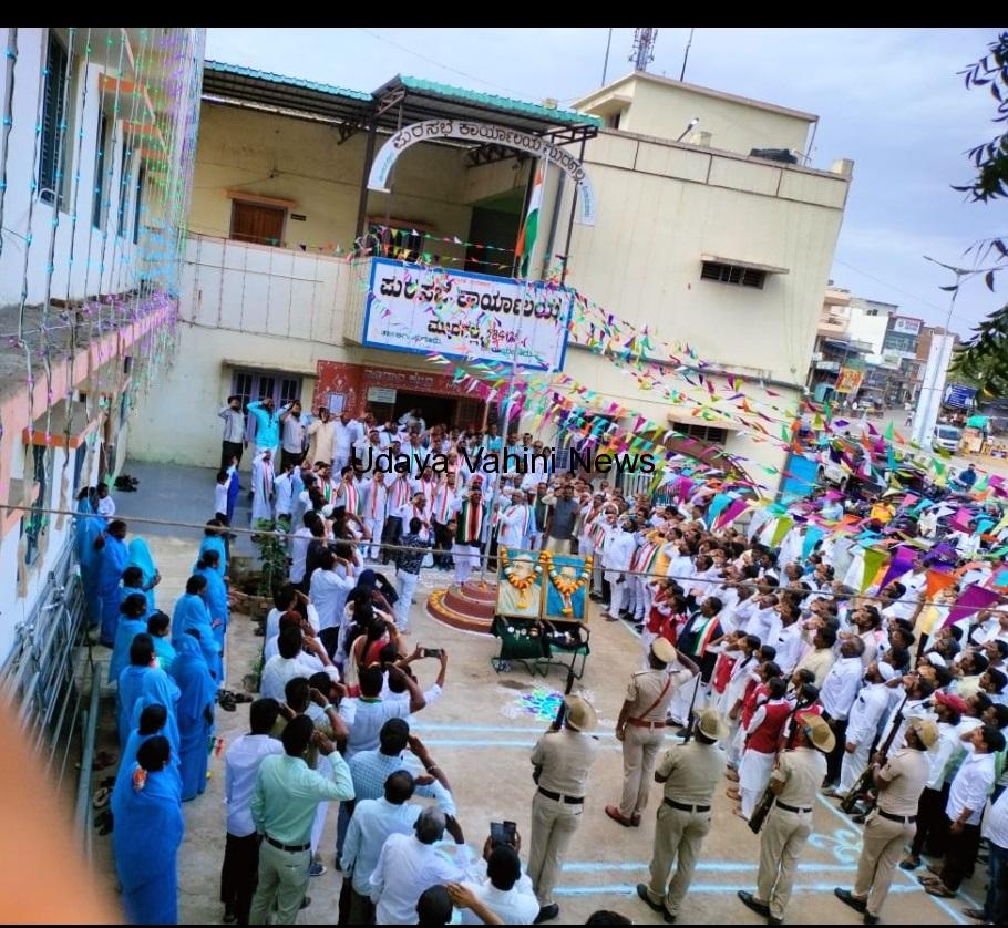 ಪಟ್ಟಣ ಪುರಸಭೆ ಸದಸ್ಯರು ಒಳಗೊಂಡು ಹಾಗೂ ಊರಿನ ಗಣ್ಯರು ಸೇರಿದಂತೆ ಮುಖ್ಯಾಧಿಕಾರಿ ನಭಿಸಾಬ ಕಂದಗಲ್ಲ ಅವರ ನೇತೃತ್ವದಲ್ಲಿ ಧ್ವಜಾರೋಹಣ ನೆರವೇರಿಸಿದರು ಹಾಗೂ ಪುರಸಭೆ ಯ ಹಿಂದೆ ನಿವೃತ್ತಿ ಹೊಂದಿದ ಸಿಬ್ಬಂದಿಗಳಿಗೆ ಹಾಗೂ 14 -08-2023 ದೇಶ ಸೇವೆ ಸಲ್ಲಿಸಿ ಬಂದ ನಿವೃತ್ತಿ ಹೊಂದಿದ ವೀರ ಯೋಧರಿಗೆ ಮುಖ್ಯಾ ಧಿಕಾರಿ ನಭಿಸಾಬ ಕಂದಗಲ್ಲ ಅವರು ಸನ್ಮಾನಿಸಿ ಗೌರವಿಸಿದರು ಹಾಗೂ ನಾಡ ಕಾಯಾ೯ಲಯ ಮುದಗಲ್ಲ ಉಪ ತಹಶೀಲ್ದಾರ್ ತುಲುಜಾ ರಾಮ ಸಿಂಗ್ ಧ್ವಜಾರೋಹಣ ನೆರವೇರಿಸಿ ಮುದ್ದು ಮಕ್ಕಳಿಗೆ ಪೆನ್ ಮತ್ತು ಪುಸ್ತಕ ನೀಡಿ. ಸ್ವಾತಂತ್ರ್ಯ ದಿನಾಚರಣೆ ಯನ್ನು ಆಚರಿಸಲಾಯಿತು. ಹಾಗೂ ಪೋಲಿಸ್ ಠಾಣೆಯಲ್ಲಿ ,ಸರಕಾರಿ ಹಿರಿಯರು ಪ್ರಾಥಮಿಕ ಶಾಲೆ ,ಪ್ರೌಢಶಾಲೆ,ಸರಕಾರಿ ಪದವಿ ಪೂರ್ವ ಕಾಲೇಜು, ಸಮುದಾಯ ಆರೋಗ್ಯ ಕೇಂದ್ರ ಮುದಗಲ್ಲ, ಸರಕಾರಿ ಕೈಗಾರಿಕಾ ತರಬೇತಿ ಕೇಂದ್ರ ಮುದಗಲ್ಲ , ವಿಜಯ ಮಹಾಂತೇಶ ಹಿ.ಪ್ರಾ. ಶಾಲೆಯಲ್ಲಿ ಶಾಲಾ ಮುದಗಲ್ಲ,ಹಾಗೂ ವಿವಿಧ ಬ್ಯಾಂಕ್ ಗಳಲ್ಲಿ ಧ್ವಜಾರೋಹಣ ನೆರವೇರಿ ಸಿದರು.