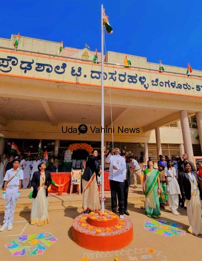 ಉದಯವಾಹಿನಿ,ಪೀಣ್ಯ ದಾಸರಹಳ್ಳಿ : ಕ್ಷೇತ್ರದ ದಾಸರಹಳ್ಳಿ ಸರ್ಕಾರಿ ಪ್ರೌಢ ಶಾಲೆಯಲ್ಲಿ 77ನೇ ಸ್ವಾತಂತ್ರ್ಯೋತ್ಸವ ದಿನಾಚರಣೆ ಆಯೋಜಿಸಲಾಗಿತ್ತು. ಕ್ಷೇತ್ರದ ಶಾಸಕ ಎಸ್ ಮುನಿರಾಜು ಧ್ವಜಾರೋಹಣ ನೆರವೇರಿಸಿ ಗೌರವ ವಂದನೆ ಸಲ್ಲಿಸಿ ಶಿಕ್ಷಕ ಶಿಕ್ಷಕಿಯರಿಗೆ ಮತ್ತು ವಿದ್ಯಾರ್ಥಿಗಳಿಗೆ ಶುಭ ಹಾರೈಸಿ ನಂತರ ಅವರು ಸ್ವಾತಂತ್ರ್ಯಕ್ಕಾಗಿ ಸಾವಿರಾರು ದೇಶ ಭಕ್ತರು ತಮ್ಮ ತ್ಯಾಗ ಬಲಿದಾನದ ಪ್ರತಿಫಲದಿಂದ ಬ್ರಿಟಿಷರನ್ನು ಹೋರದೊಡಿಸಿದ ಕೀರ್ತಿ ಎಲ್ಲಾ ಮಹಾನ್ ಹೋರಾಟಗಾರರಿಗೆ ಗೌರವಪೂರ್ವಕವಾಗಿ ನಮನಗಳನ್ನು ಸಲ್ಲಿಸು ಪವಿತ್ರ ದಿನ ಸ್ವತಂತ್ರ್ಯೋವ ದಿನವೇ ಭಾರತೀಯರಿಗೆ ದೊಡ್ಡ ಹಬ್ಬ ಎಂದು ಶಾಸಕ ಎಸ್ ಮುನಿರಾಜು ಮಕ್ಕಳನ್ನು ಉದ್ದೇಶಿಸಿ ಮಾತಾಡಿದರು.